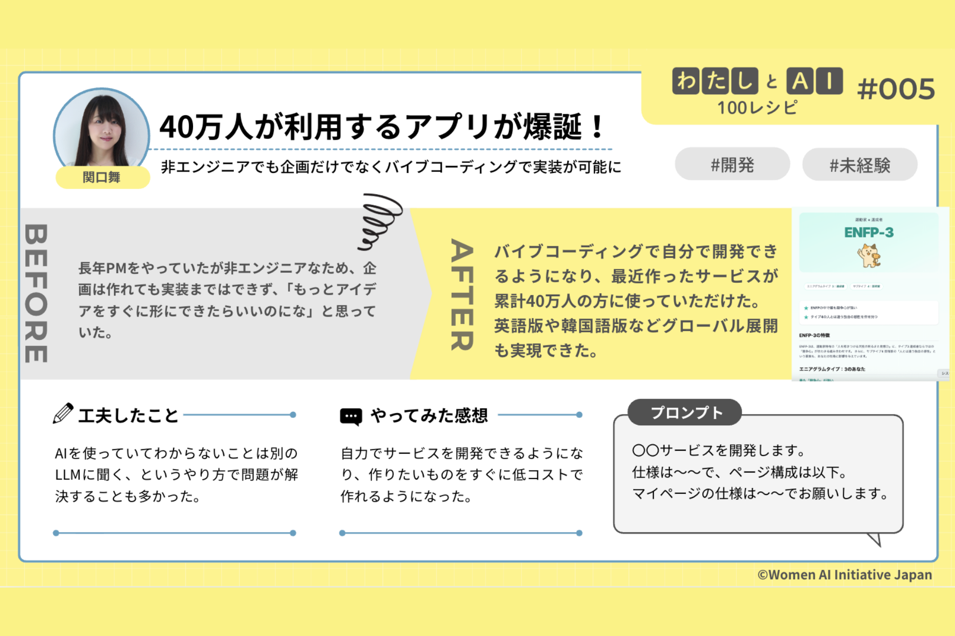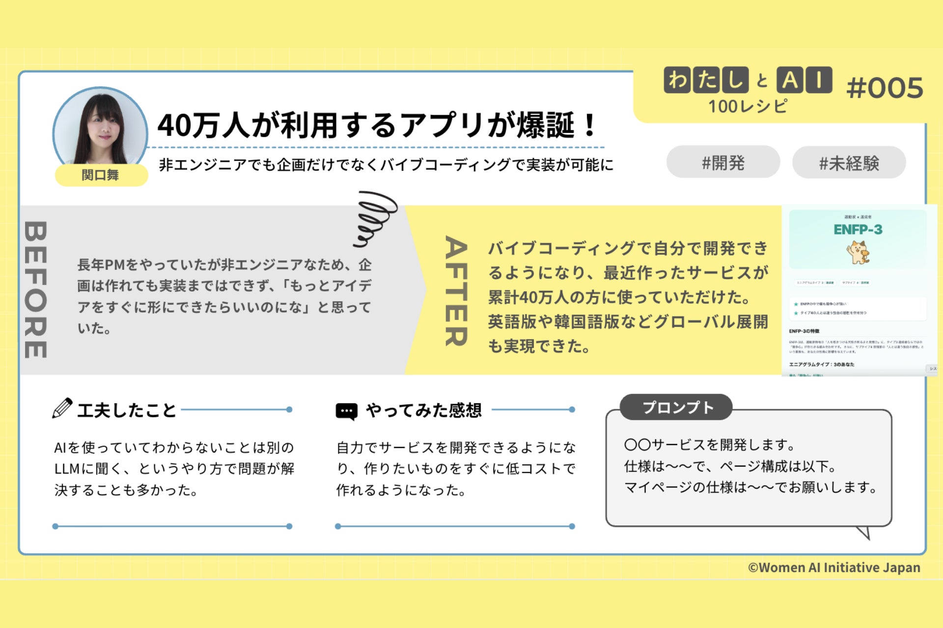 一般社団法人Women AI Initiative Japan(所在地:東京都渋谷区、代表理事:國本 知里、以下、WAIJ)は、3月8日(日)の国際女性デーに合わせ、女性の100通りの生成AI活用事例集『#わたしとAI 100レシピ』を公開しました。