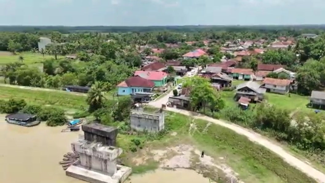 カリパシール村は、バンダールランプン空港から車で2時間強。途中で村境の大河(バタンハリ川)を越えますが、陸路はなく、唯一の交通手段は渡し船です。かつては橋の建設を目指したものの、実現せず、作りかけの橋げたが約30年間放置されたままとなっています。
