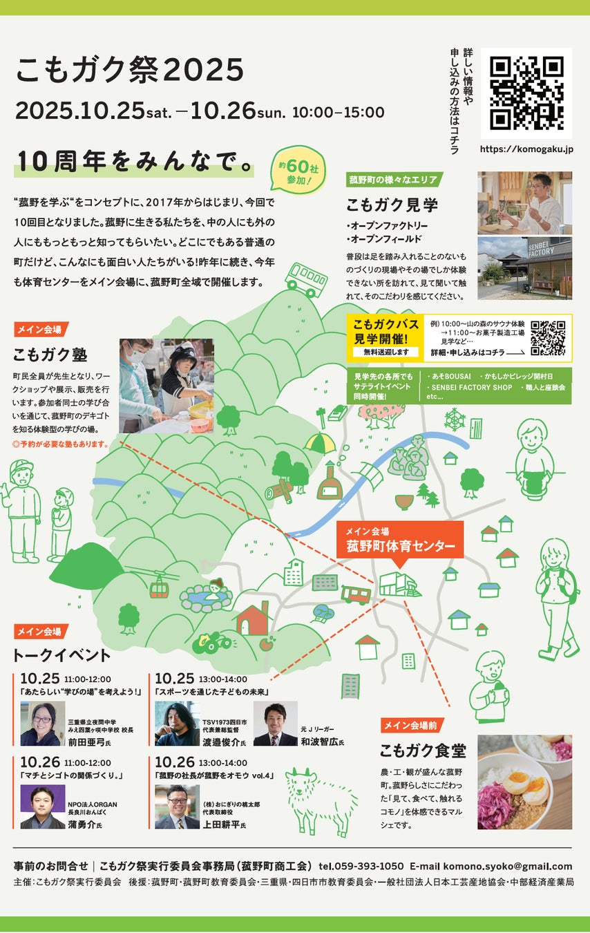 今年で10回目の「こもガク祭」。こもガク実行委員会は、2025年10月25日(土)・26日(日)に菰野町体育センターおよび町内各所で開催します。地元の魅力に触れられる体験型イベントです。