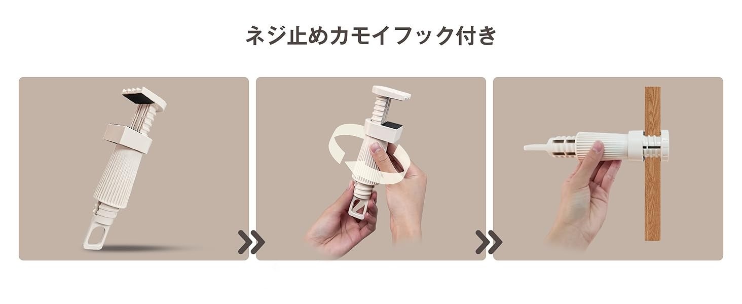カモイフック付き: ネジ止め式のカモイフックが付属しており、リビングや寝室、玄関など、ハンガーがない場所でも簡単に設置可能です。