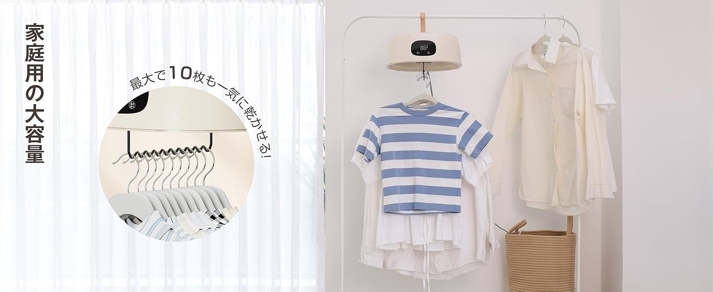 コンパクトな設計でありながら、耐荷重は約10kgを実現しています。シャツやタオルなどを8~10枚、一度に乾燥させることが可能です。ミニ衣類乾燥機でありながら、毎日の洗濯を行う一人暮らしの方や、お子様がいらっしゃるご家庭のニーズに応える大容量設計です。
