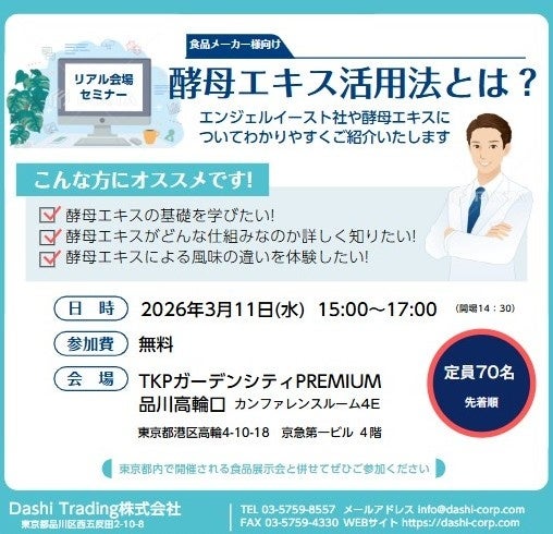Dashi Corporation株式会社(本社:東京都品川区、代表:水野 勉)の子会社であるDashi Trading株式会社(本社:東京都品川区、代表:水野 勉)は、世界トップブランドであるエンジェルイースト社(正式名称:安琪酵⺟股分有限公司)と共催し、酵母エキスについて学ぶ無料セミナーを2026年3月