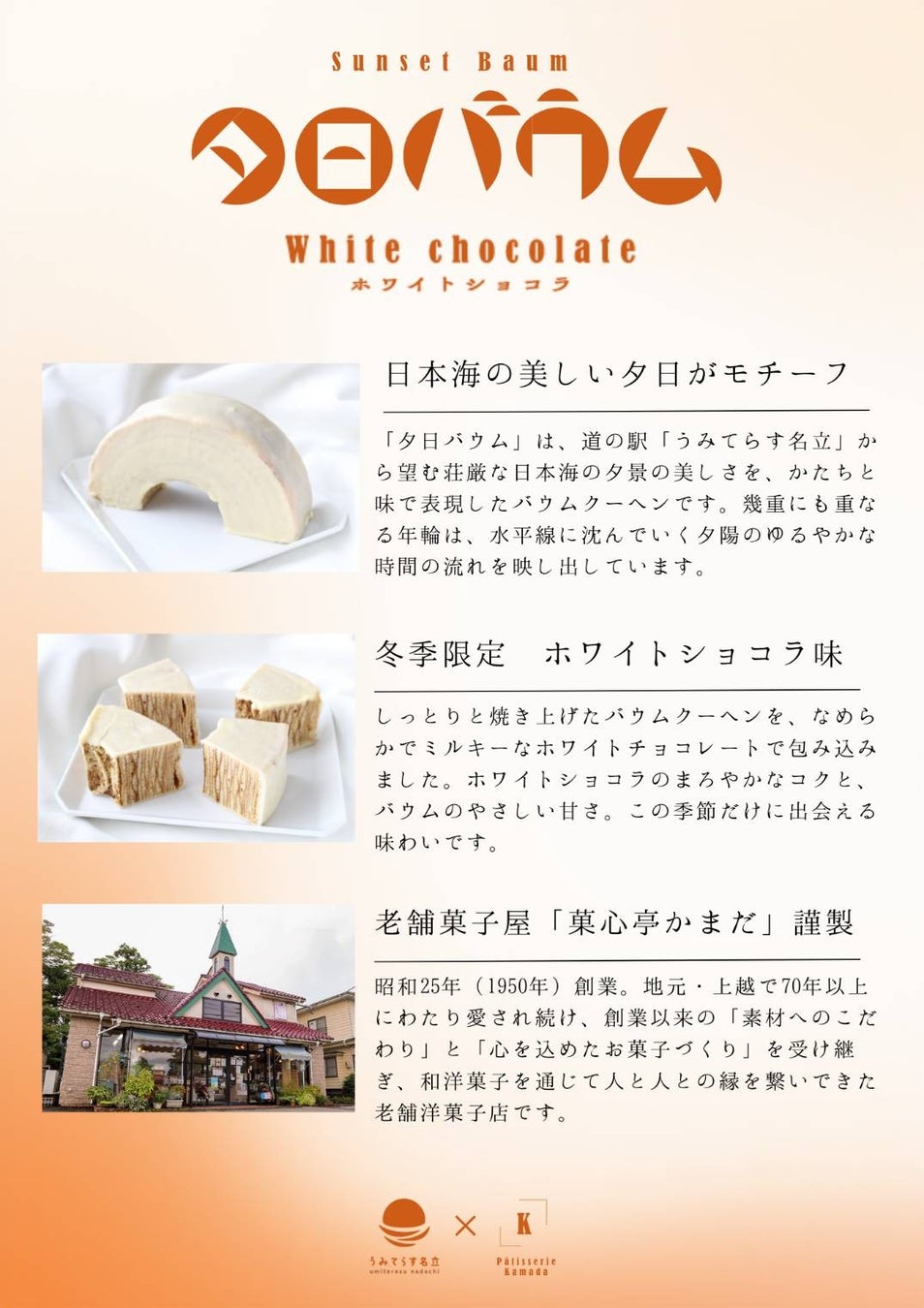 「夕日バウム ホワイトショコラ」は、昨年7月に「道の駅 うみてらす名立」25周年記念企画として発売された人気商品「夕日バウム」の季節限定フレーバーとして登場する新商品です。