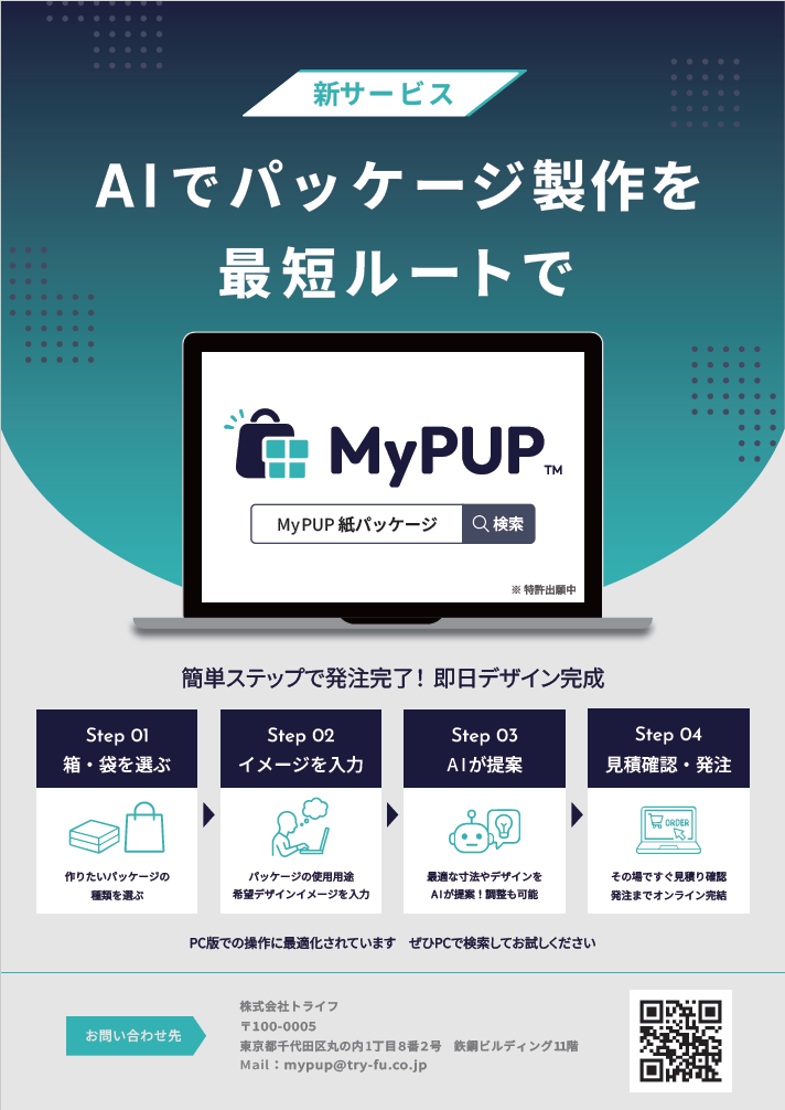 特種東海製紙グループの株式会社トライフ(住所:静岡県島田市横井1-1-1、代表取締役社長:宮尾圭一)は、パッケージ製作をオンラインで完結できる「MyPUP(マイパップ)」は初期費用込みのサービスを提供中。