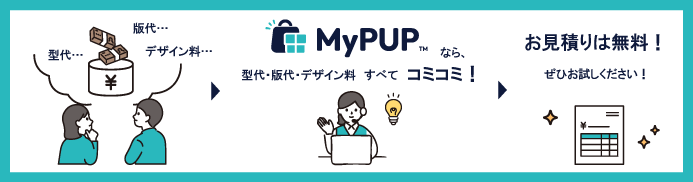 MyPUPなら型代や版代が込み。もちろんデザイン料も全て込み。追加費用の不安を解消します。