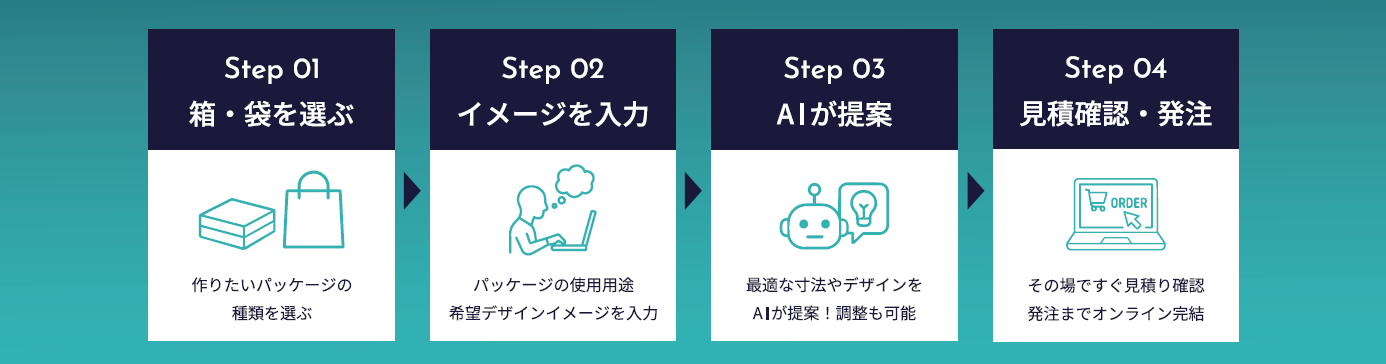 ユーザーが内容物の種類や数量、デザインイメージなどを入力すると、AIが箱や袋のサイズ感とデザインを提案(デザインを自分でお持ちの方は、そちらを入稿いただく形でも発注が可能です)。展開図・立体図で完成形のイメージを確認しながら、特別な知識がなくても簡単に操作できます。