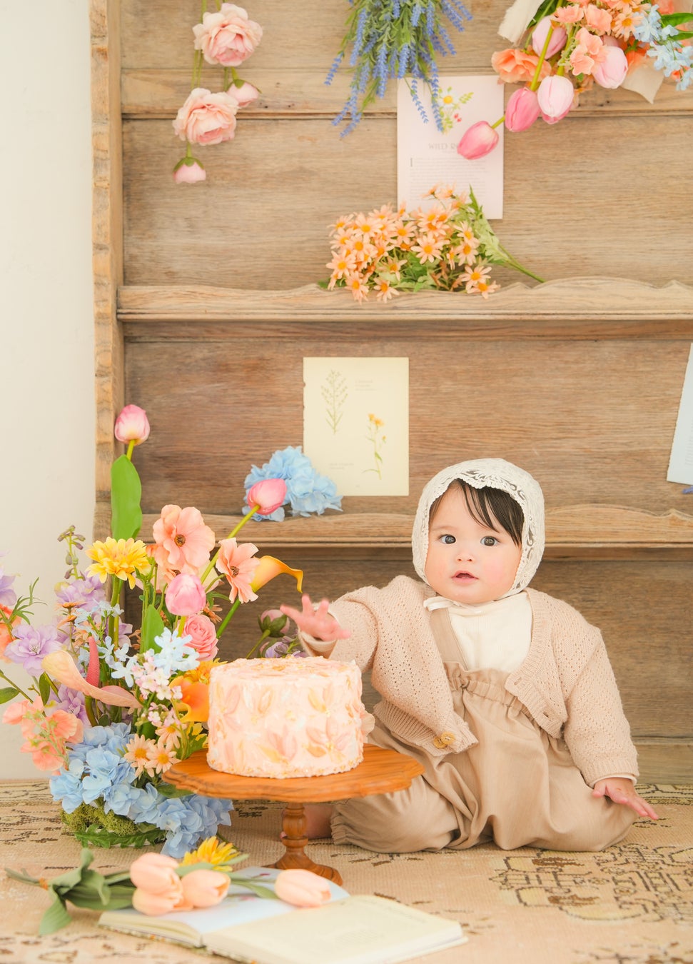 唯一無二の世界観でファンの多いフォトグラファーMizukiが手がけた、こだわりの木製シェルフ(棚)と軽やかな淡い色味の花であしらった、ナチュラルで華やかさもある空間で、お子さまのイマしかない瞬間を写し取る撮影体験をお届けします。