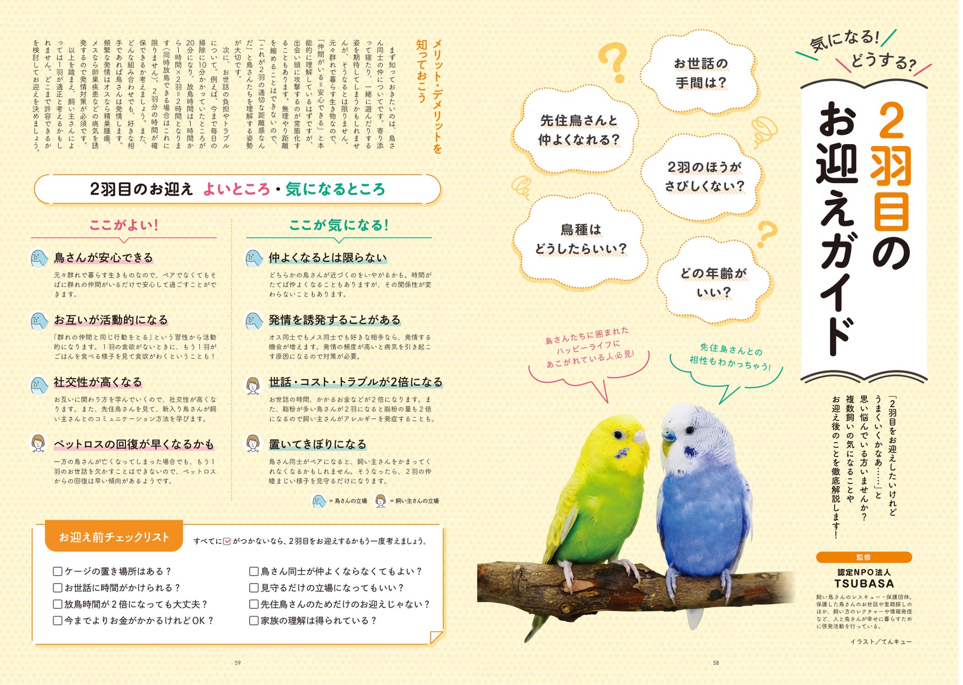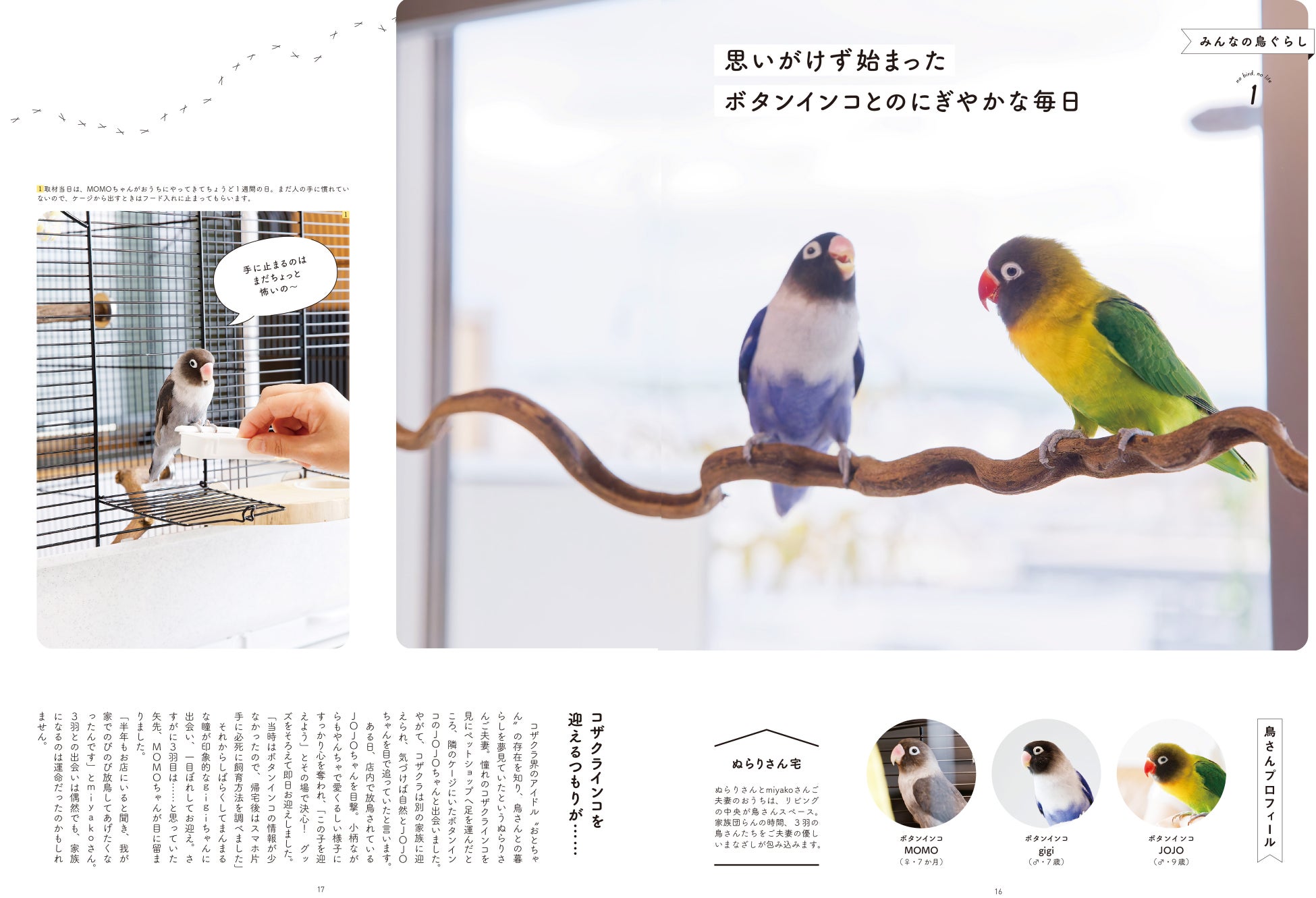 『鳥ぐらし』は、鳥と幸せに暮らすためのヒントが詰まった実用ブック。鳥を飼っている人もこれから飼いたいという人も知っておきたい実用的な飼育情報と、見て楽しめる癒しページ。幅広い内容が魅力です。