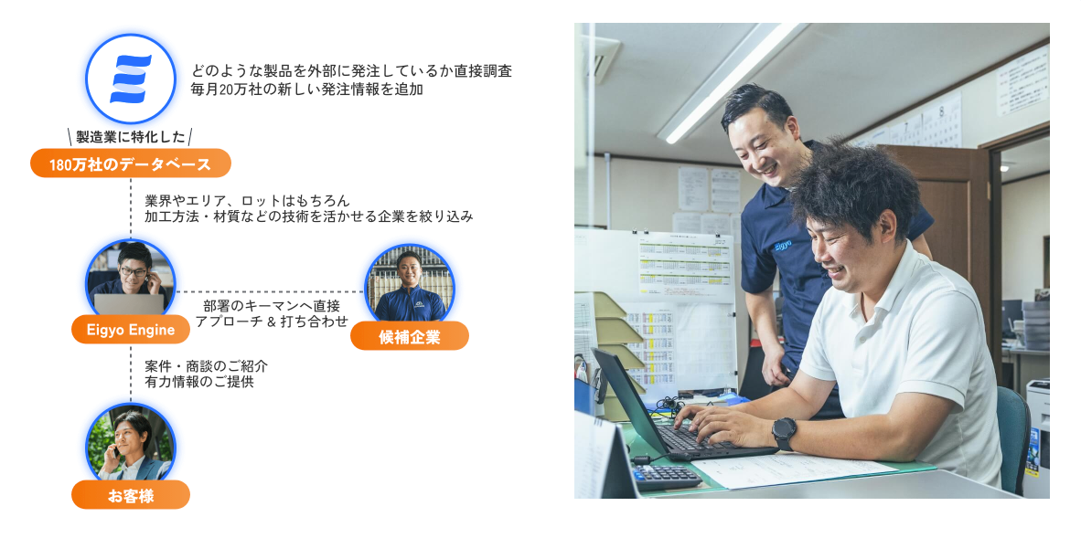 Eigyo Engineは、製造業に特化したデータベースと、技術を必要としている企業の絞り込みを駆使して、専任リサーチャーが企業を厳選し、「強みを活かせる案件」をご紹介する営業代行・マッチングサービスです。