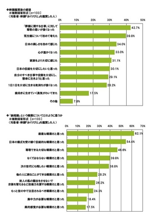 次に、「映画『おくりびと』を鑑賞した」と回答した103名に対し、映画鑑賞後の感想を聞いたところ(複数回答形式)、「『葬儀に関する仕事』に対して尊敬の思いが強くなった」が42.7%で、最も多い回答となりました。次に多かった回答は「死生観について改めて考えた」39.8%、続いて「日本の美しさを改めて感じた」34.0%という結果になりました。 さらに、映画に登場した「納棺師」という職業についてどのように思うかを複数回答形式で尋ねたところ、トップになったのは「厳粛な職業だと思った」62.1%、2位「日本の儀式を受け継ぐ伝統的な職業だと思った」54.4%、3位「尊敬できる大切な職業だと思った」46.6%となっています。