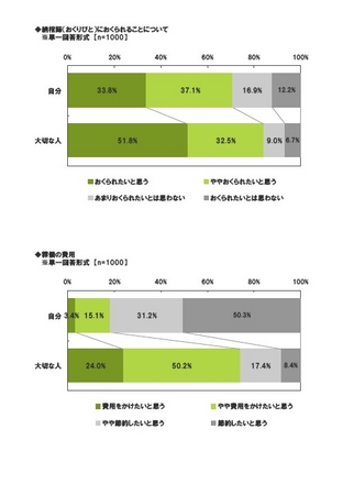 さらに、「大切な人」の葬儀の費用について聞いたところ、『費用をかけたいと思う』(「費用をかけたいと思う」24.0%、「やや費用をかけたいと思う」50.2%)という回答は74.2%となり、「大切な人」のほうが「自分」の数値を55.7ポイントも上回る結果となりました。このように、「自分」の葬儀の費用は節約したいものの、「大切な人」の葬儀の費用はなるべくかけてあげたいというような結果となりました。