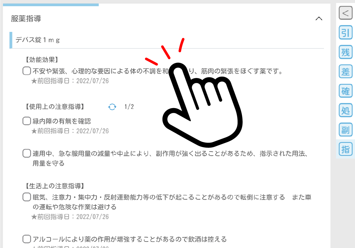 処方内容のチェック機能によって、指導文の候補を表示します。
