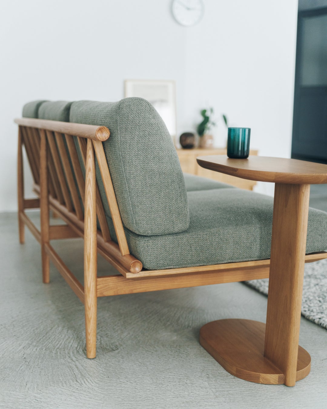 長く使い続けられる、飽きのこない普遍的なデザインのアームレスソファ。オーク材を生かした、繊細なラインが特徴です。脚部はテーパーのかかったデザインで、すっきりとした印象に。背面のレクタングルのスポークは、インテリアのアクセントになります。壁付けだけでなく、お部屋の間仕切りとしてのレイアウトもおすすめです。