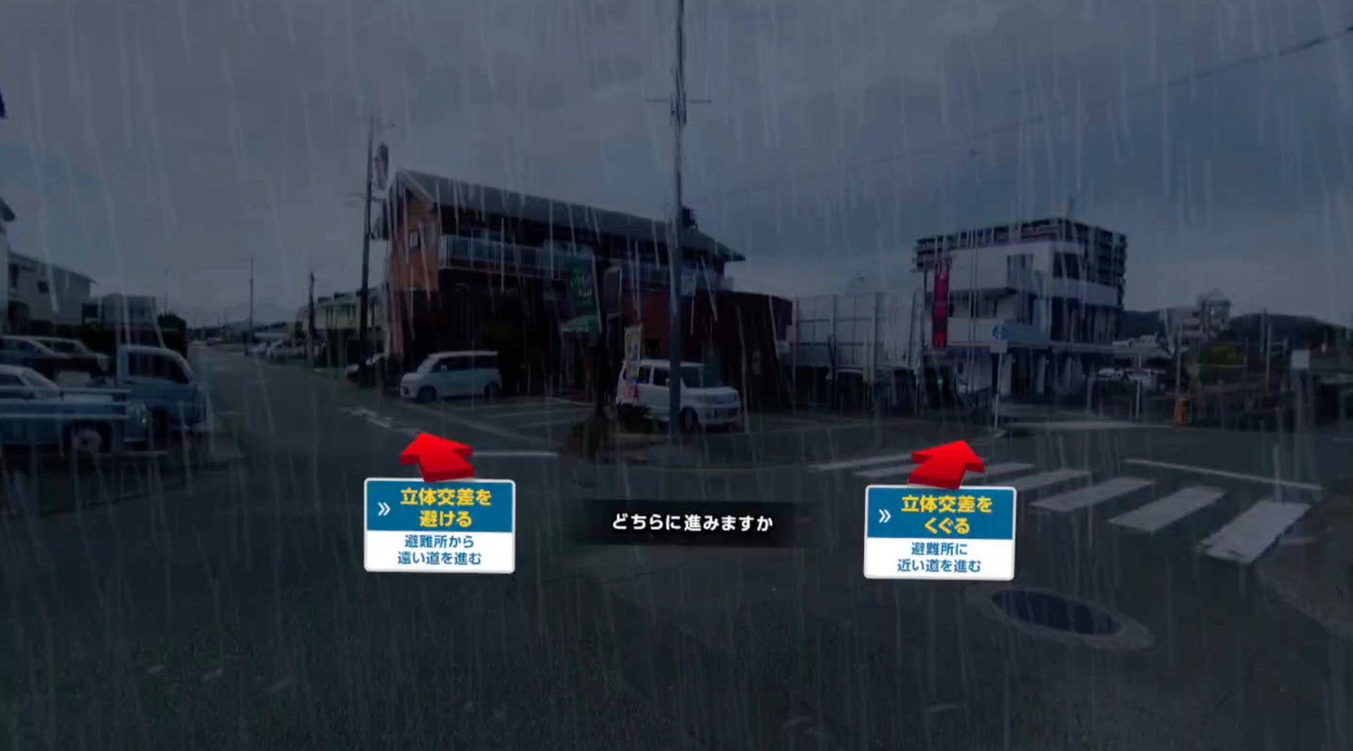 コンテンツ内では避難ルートの分岐ポイントが3つあり、 被験者にそれぞれ以下の選択が迫られ、自分だったらどう行動するかを考え発災時をリアルに想像しながら避難シミュレーションを体験してもらいます。水害のシナリオ作成にあたっては、熊本大学先端科学研究部・本間里見教授と、内山忠准教授に監修を依頼しております。