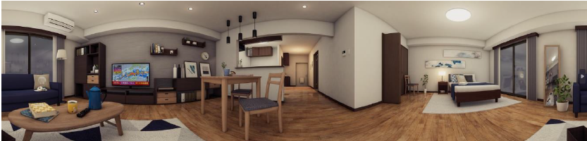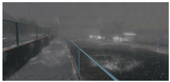 本防災VRコンテンツは、玉名市松木南児童公園付近の自宅にいるシーンから始まります。外は大雨、テレビからは大雨警戒レベル4の避難指示がでている状況の中、玉名市の災害時一時避難場所及び垂直避難建物に指定されている『玉名市文化センター』を目指して避難する過程を疑似体験できる構成です。