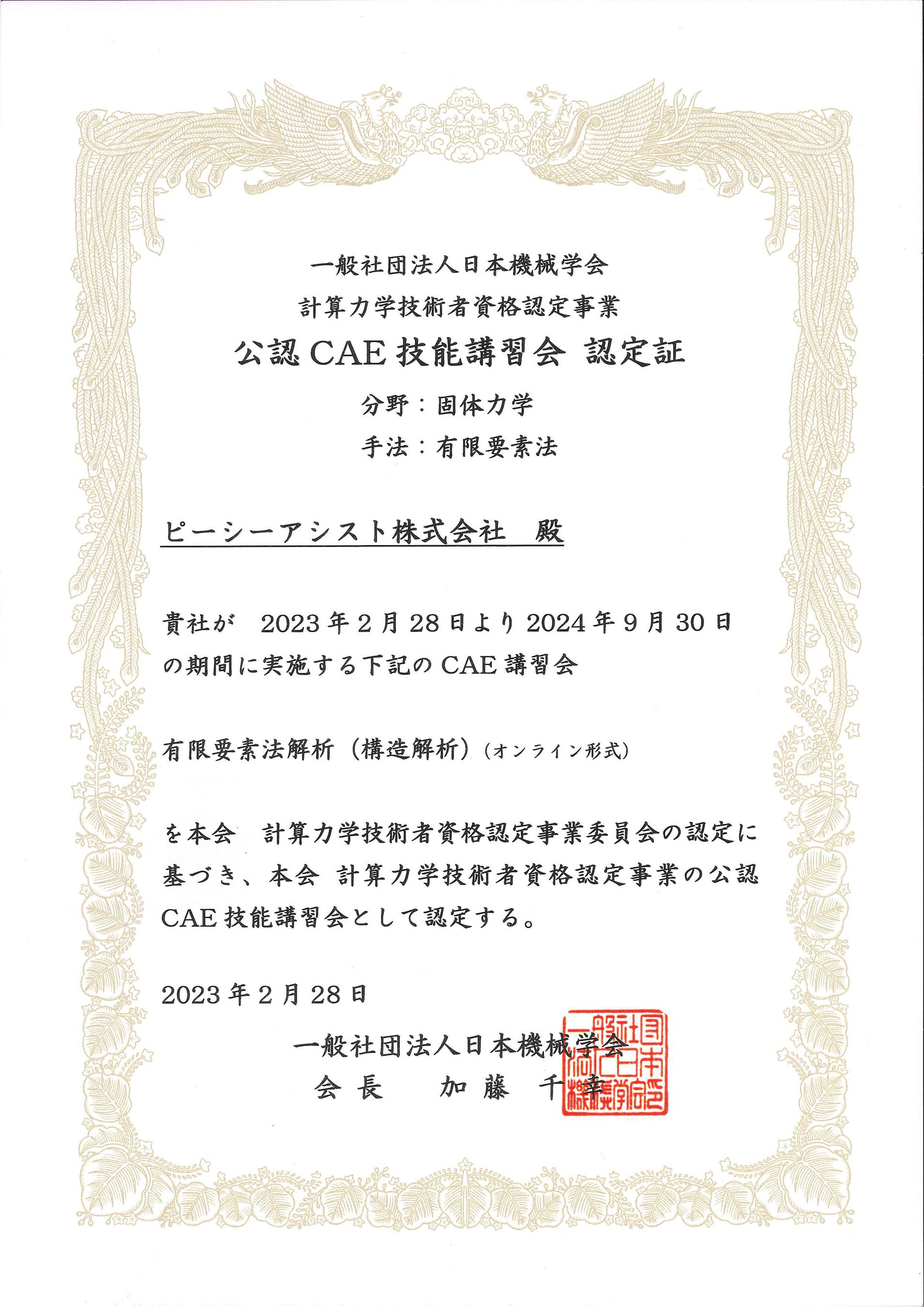 法人研修サービスやパソコンスクールを展開するピーシーアシスト株式会社(以下、「当社」)が、一般社団法人日本機械学会 計算力学技術者資格認定事業委員会から「公認CAE技能講習会(固体力学分野)」の実施団体に認定されました。