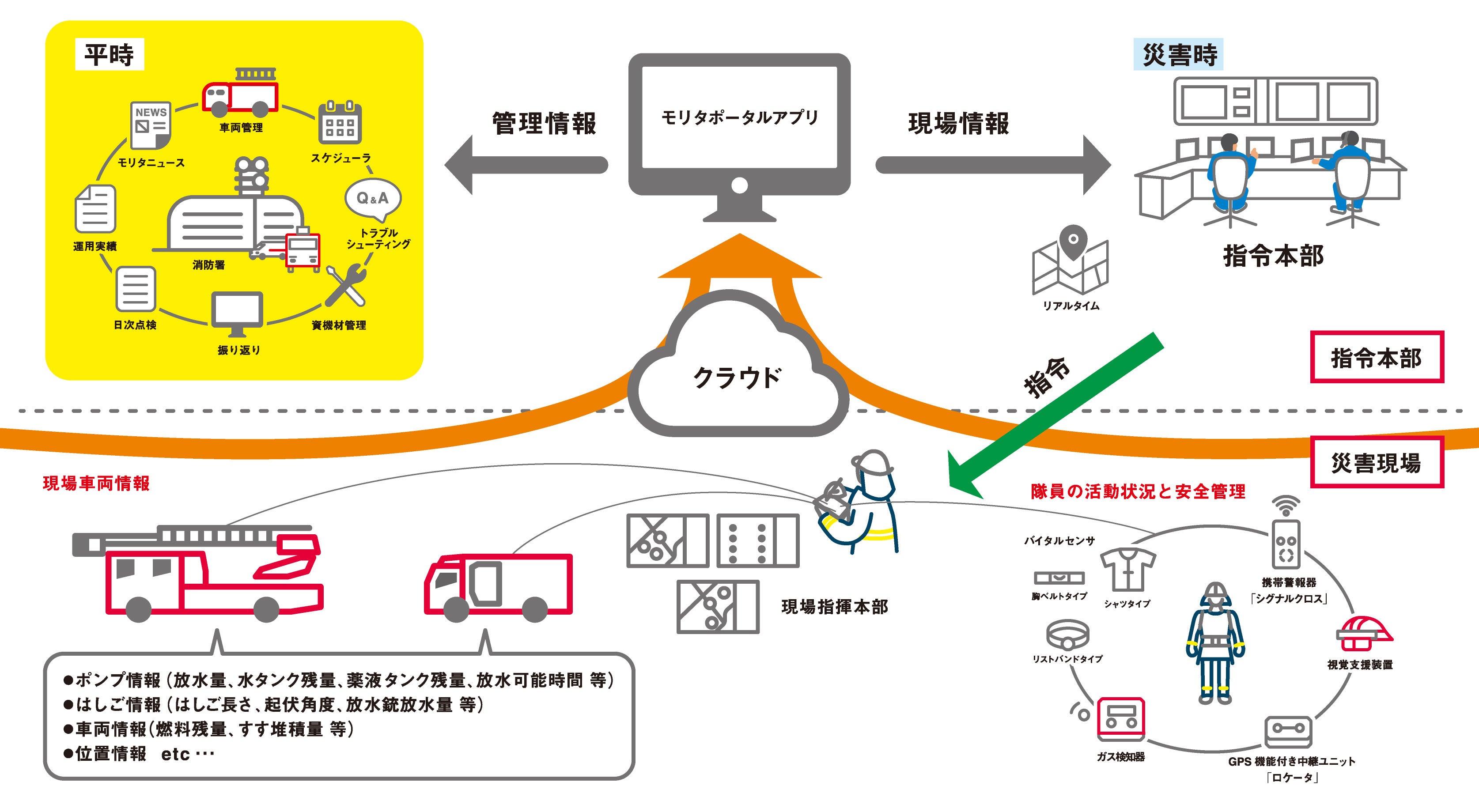 災害現場の実態や隊員のおかれた環境、コンディション、また消防車両をはじめとする機材の情報をリアルタイムで捉え、指揮本部・指令本部に提供し、安全性と消防力の向上に貢献します。また、平時にはポータルアプリで、消防車両の運用状況の確認やメンテナンス情報の管理など、煩雑な管理業務をサポートします。