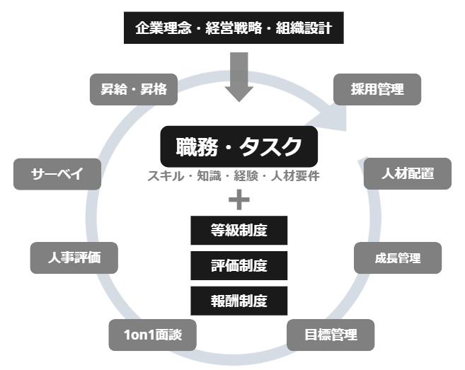 経営理念から組織・職務定義、採用、配置、人材育成、1on1、サーベイ、評価、賃金査定がシームレスに連動し組織と人材を次のステージに導きます。