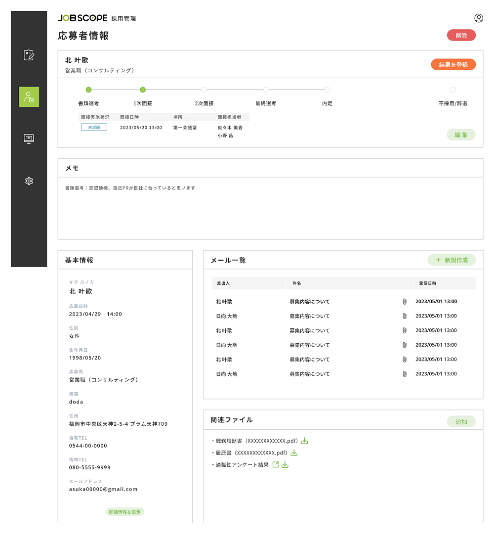 採用管理機能(ATS)では、各種媒体やエージェント会社、及び応募者の情報を一元的に管理して採用プロセスの効率化を図ります。応募者の応募書類管理だけでなく、事前アンケートの設定他、面談日時もお使いのスケジュール管理システムと連動して自動的に面接日時候補を応募者に提案します。また、書類審査後においては、適職性検査として、応募者のパーソナリティ診断、行動特性、コンピテンシー分析、仕事に対する価値観もオンラインサーベイで実施できます。これにより、採用候補者の適職性だけでなく、応募職種での自社とのマッチ度、カルチャーフィットを把握することも可能です。