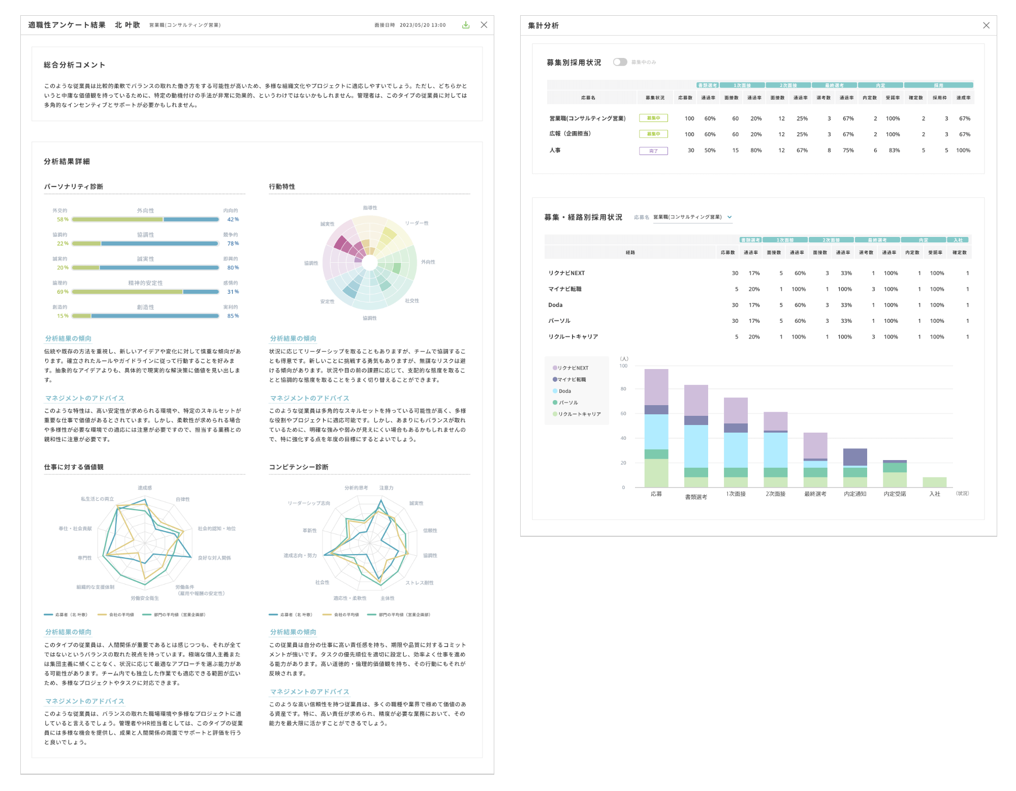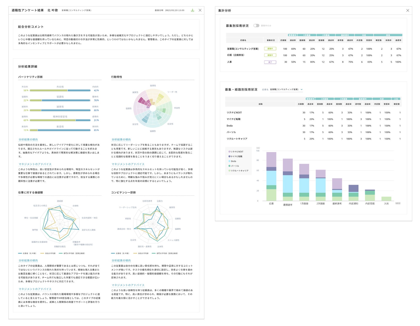 適正診断機能:候補者のコンピテンシーや適性を評価する診断ツールを組み込み、より適切なタレントの採用をサポート。4つの診断からの候補者の特性と適職性アドバイス他。