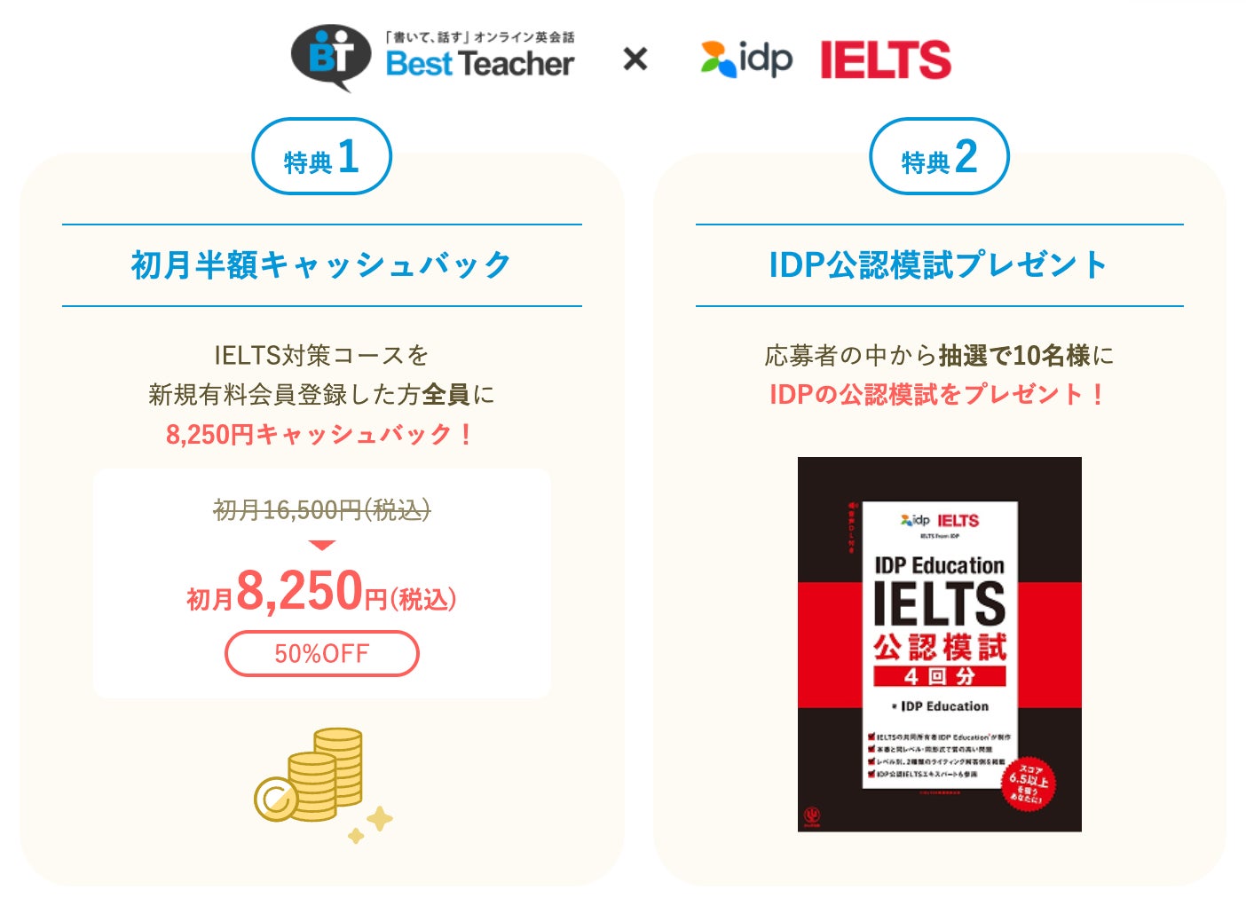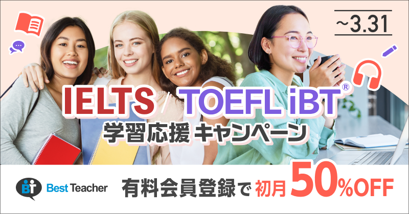 「書いて、話す」オンライン英会話サービス「ベストティーチャー(Best Teacher)」を運営する株式会社ベストティーチャー(本社:東京都渋谷区、代表取締役社長:高宮敏郎)は、2026年3月1日より、「IDP Education Japan共催 IELTS学習応援キャンペーン第2弾」および「ETS Japan共催 TOEFL iBT®学習応援キャンペーン第3弾」を開催いたします。両キャンペーンでは初月受講料(1ヶ月分)の半額8,250円キャッシュバックに加え、抽選で公式/公認模試をプレゼントいたします。