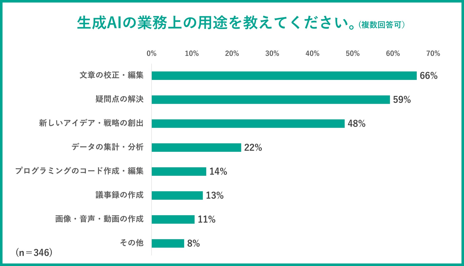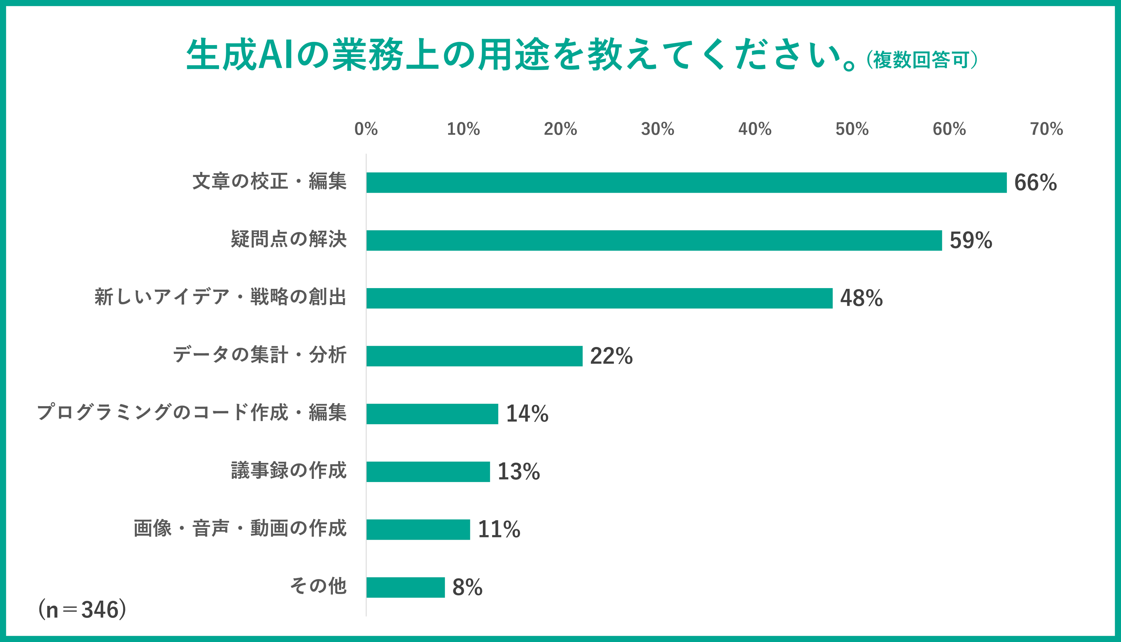 生成AIの業務上の用途としては、「文章の構成・編集」(66%)が最も多く、次いで「疑問点の解決」(59%)、「新しいアイデア・戦略の創出」(48%)と続きました。また、「プログラミングのコード作成・編集」や「画像・音声・動画の作成」という上級者も一定数いました。