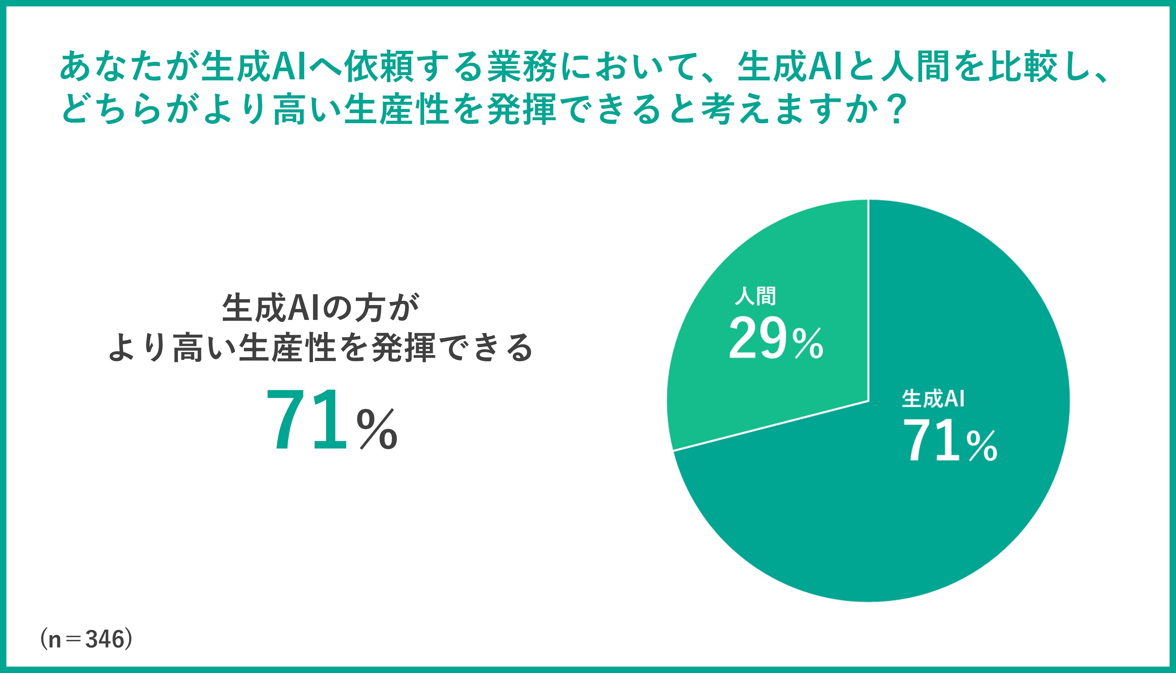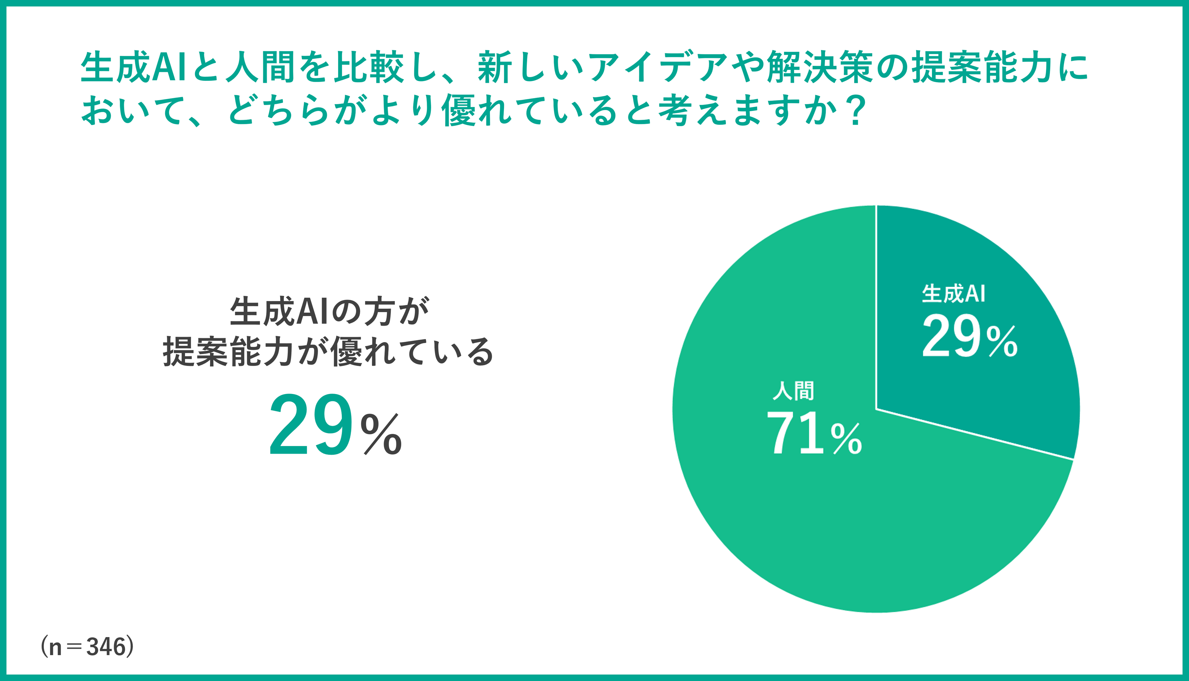 続いて、①生産性 ②新しいアイデアや解決策の提案能力 ③業務上の相談相手、の3つの観点から生成AIと人間のどちらに優位性があると思うか質問したところ、①の生産性については、71%が「生成AIの方がより高い生産性を発揮できる」と回答した一方で、②の新しいアイデアや解決策の提案能力は「生成AIの方が優れている」と回答した方が29%に留まりました。なお、③の「業務上の相談相手」については「生成AIの方が適している」と回答した方が27%と、約3割の方が業務上の相談相手として上司や同僚より生成AIを優先していることが分かりました。