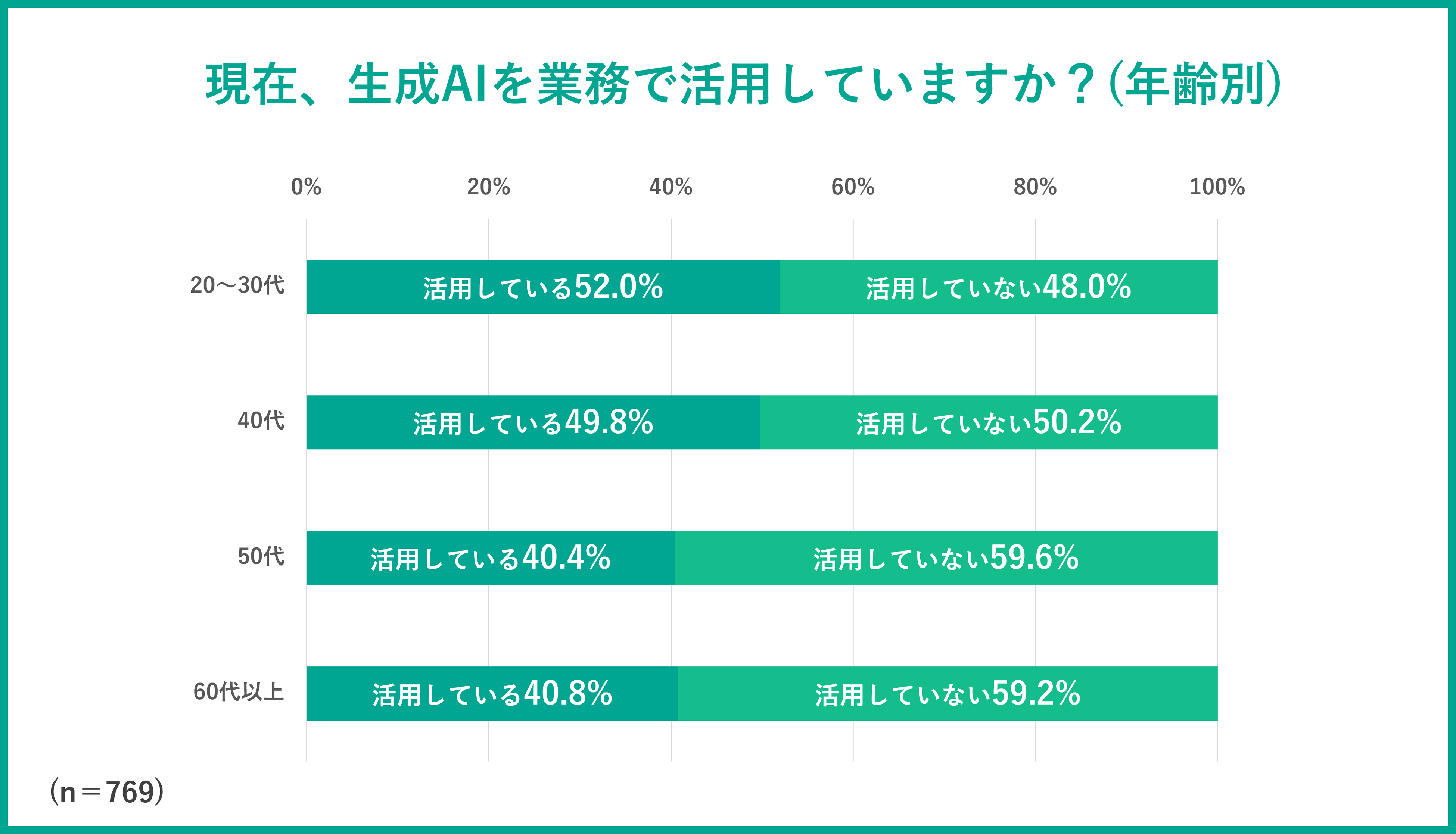 ハイクラス人材に「生成AIの業務活用」について質問したところ、全体の45%が「活用している」と回答しました。年齢別に見ると、20~30代の活用が最も多く(52%)、年齢が上がるにつれて活用率が低下しているものの、60代以上でも約4割に上りました。幅広い年代に満遍なく普及していることが伺えます。