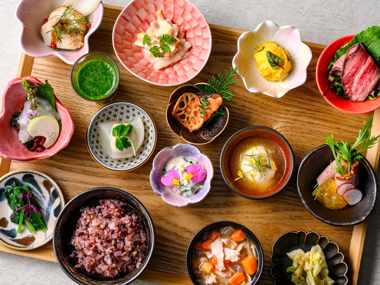 古くから親しまれる和食の基本形"一汁三菜"に三菜を付け加えた「一汁六菜」を、カジュアルな定食でお楽しみいただけるレストラン。