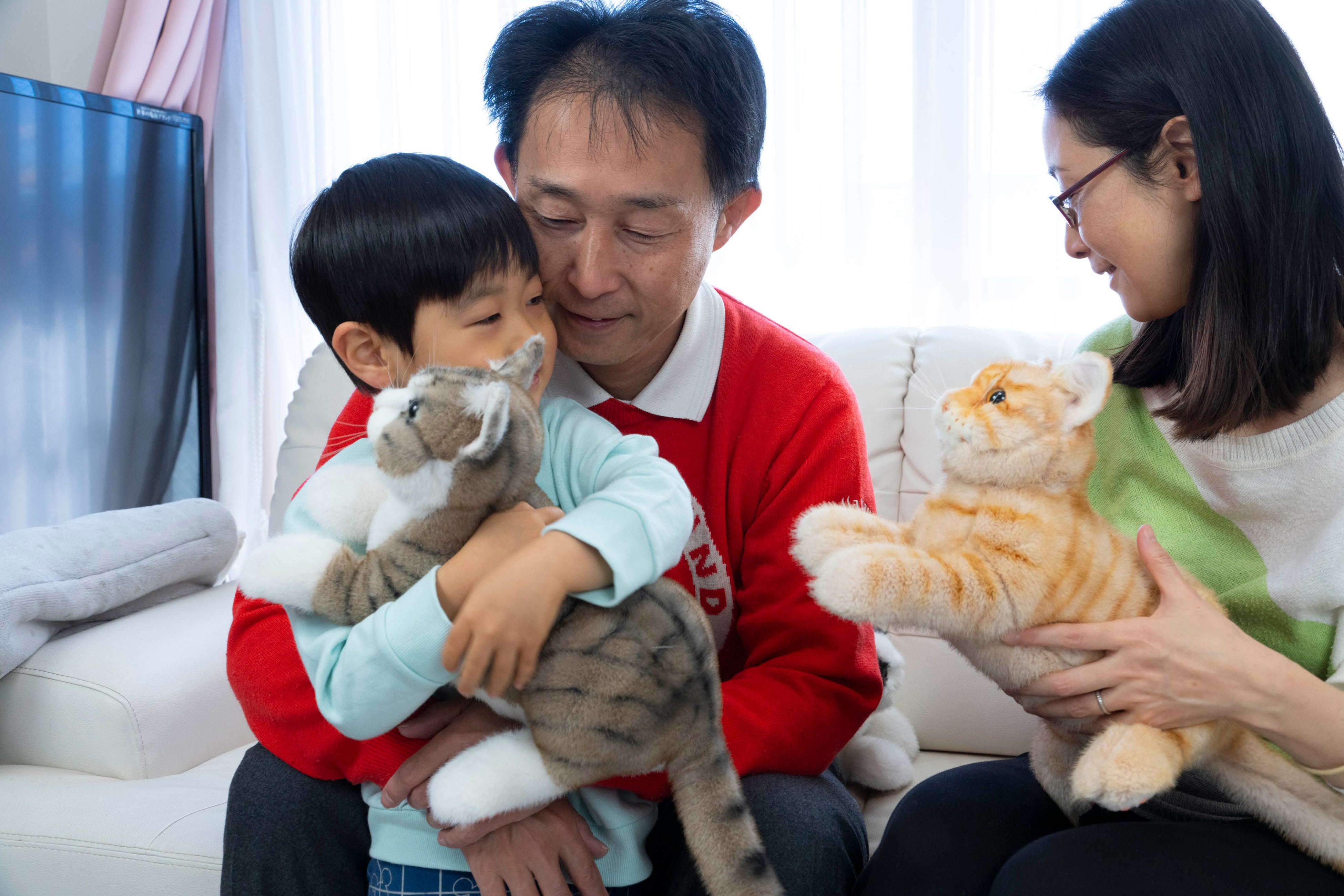 開発上のこだわりポイントとしては、撫でると鳴くセンサーを、のど・頭・背中・しっぽに配置しました。サラサラの生地は手触りも良く、リアルな柄はスプレーの手塗で再現しています。、撫でると猫の声で鳴くので、まるで本物の猫と、一緒に暮しているような体験ができます。