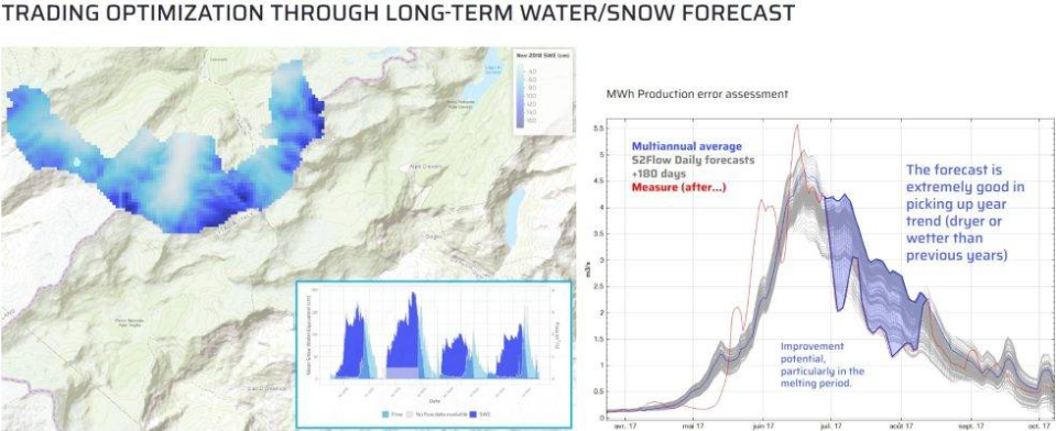 Wegawは、地上での目視による観測に加えて、衛星データやヘリコプターによる調査、ドローンの活用など、あらゆる地域に展開可能な地理空間技術を組み合わせることにより、作業員が立ち入れないエリアの積雪・融雪状況を一日単位で迅速にモニタリングできる技術を有しております。このモニタリング技術により、積雪の深さを表すHS(Snow Height; 積雪深)と積雪が融解したときの水量を表すSnow Water Equivalent (SWE; 積雪水当量)の正確なマップを作成することができます。これらを活用することにより、水力発電所が管理するダムへの流入水量の予測精度を高め、ダムやタービンなどの設備管理や修繕計画の最適化が可能になります。また、Wegawの雪と水のデジタルツインは、現在の状況だけでなく将来の融雪後の流入水位も推定することができ、より迅速、且つ、的確な意思決定を支援します。