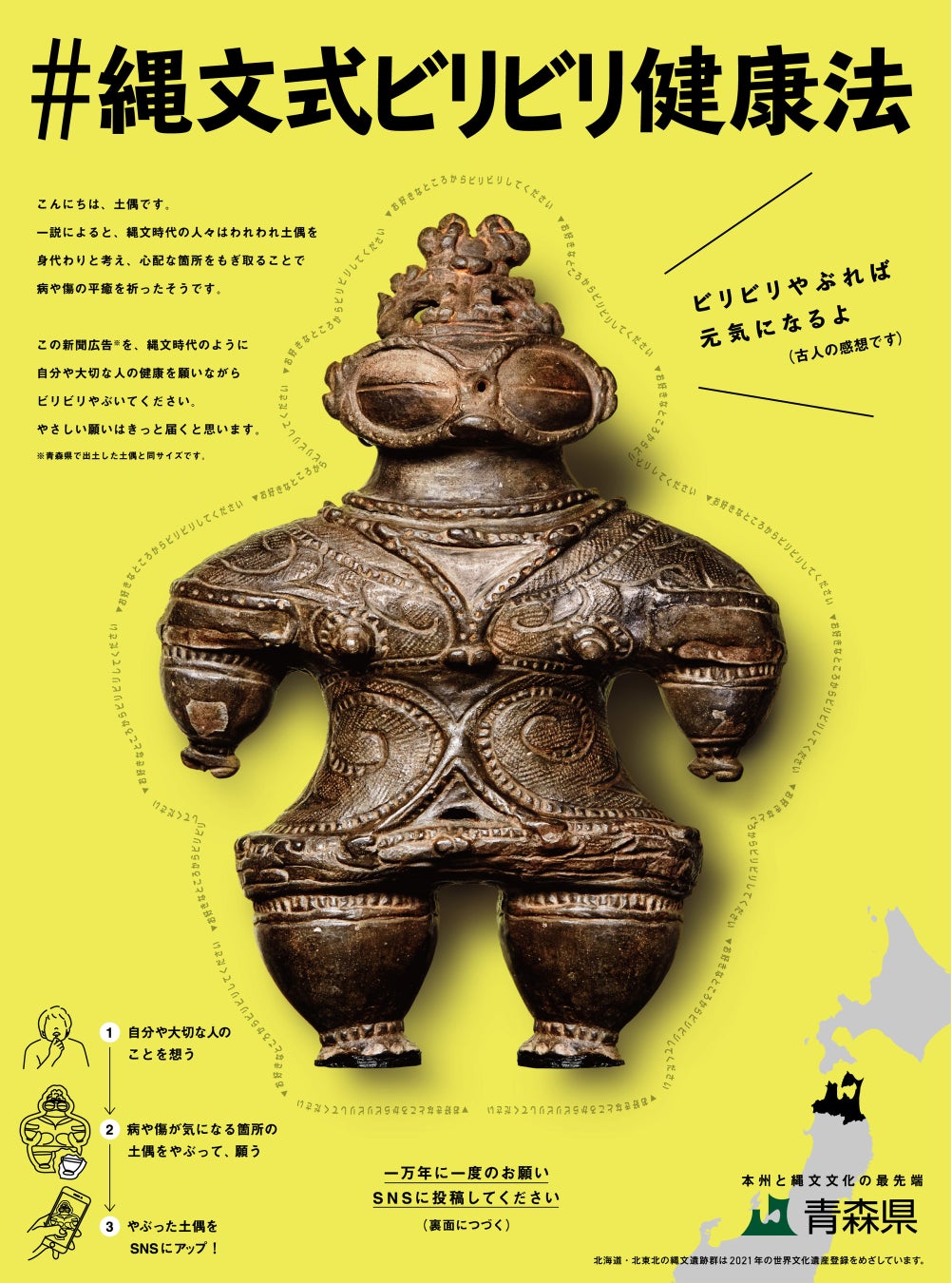 青森県を含む「北海道・北東北の縄文遺跡群」が世界文化遺産登録間近だった2021年3月、本来ならばメディアから注目を得て観光客の増加も見込まれたはずがコロナの影響でほとんど全国的な話題にならない状況となってしまった。そこでアフターコロナを見据え、県と遺跡群の想起を深め、話題を作るための広告を制作。ほとんどの土偶が一部欠けた状態で出土している有力な説に「健康祈祷・身代わり」があり、それをコロナ禍で誰かの健康を祈る現代の人々の気持ちに置き換えた。新聞をやぶるという仕掛けを作り、広告内で土偶自身が「SNSでバズりたい」というメッセージを出し、遺跡群のアピールを行うことで実際に多くの投稿を生み出した。遺跡群は2021年7月に正式に世界文化遺産に登録された。