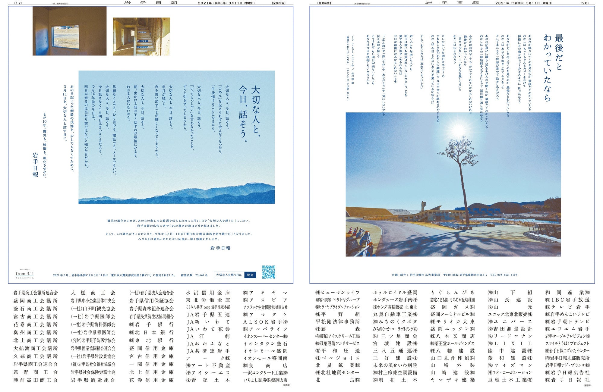東日本大震災から6年目の2017年、当地においても急速に進んでいた記憶の風化をくいとめ、100年後に震災体験者がいなくなっても語り継げるプラットフォームづくりを目指し、「3月11日を岩手県民の日に制定する」ことを目指して本プロジェクトがスタートした。4年にわたり、キャンペーンコピー「最後だとわかっていたなら」をテーマに広告および署名活動を展開。最終的に寄せられた23669筆の署名を携え、2021年2月に、3月11日を県民の日「東日本大震災を語り継ぐ日」とすることが岩手県議会の全会一致で採択され、県条例で定められた。これにより、未来に震災の悲劇と防災が伝えられていくことを目指している。