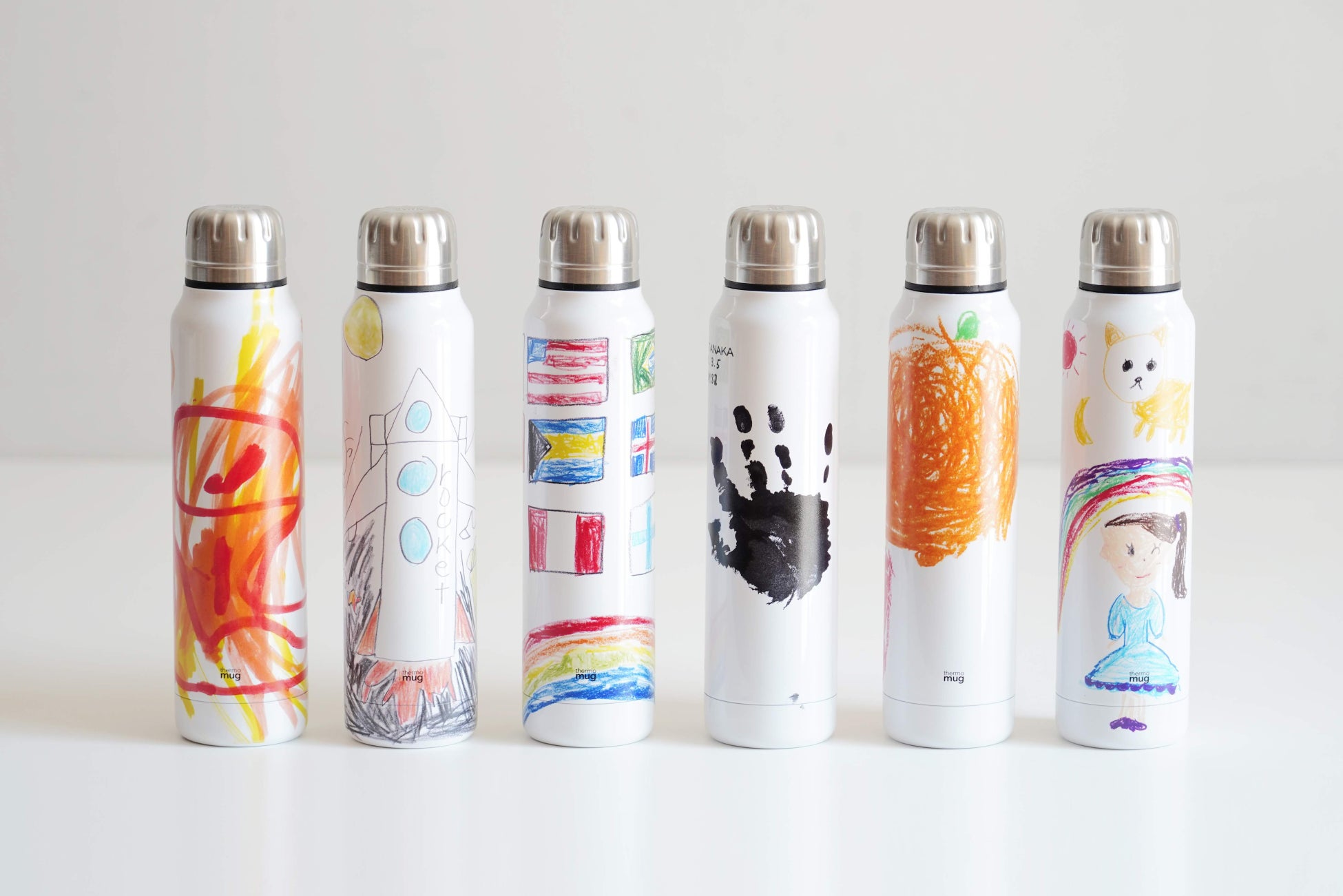 手書きの絵やメッセージがそのままデザインに、自分だけのオリジナルボトルが作れるワークショップ。一枚の専用紙に好きな絵を描くだけ。 「thermo mug」 の代表的な “Umbrella Bottle(アンブレラ ボトル)”は機能性に優れ、持ち運びに最適。思い出づくりとしてだけでなく、プレゼントにもおすすめ。