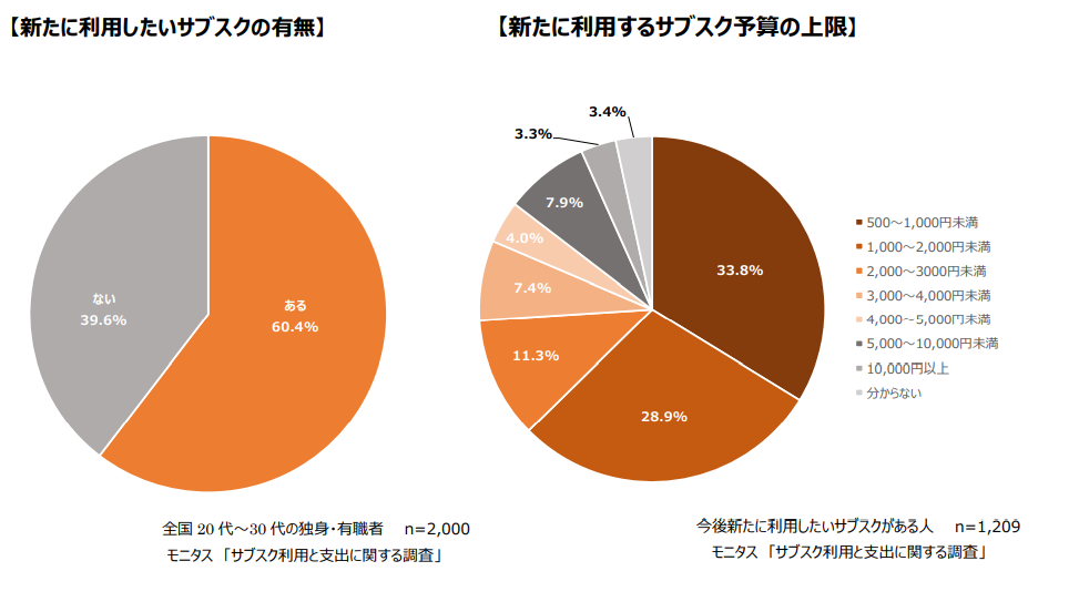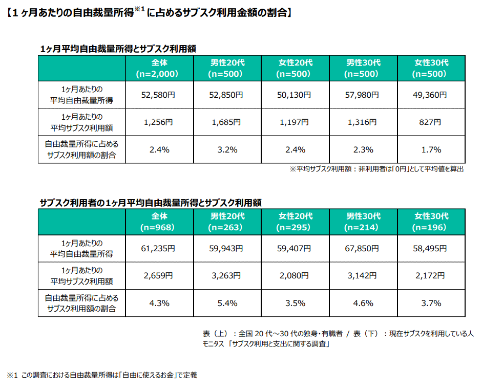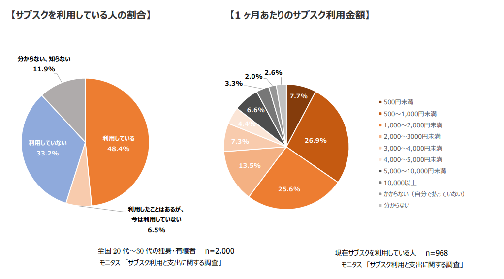 株式会社モニタス(本社:東京都港区、代表取締役社長:林 秀紀)は、全国20代~30代の独身・有職者2,000名を対象に実施した「サブスク利用と支出に関する調査」の結果をご報告いたします。