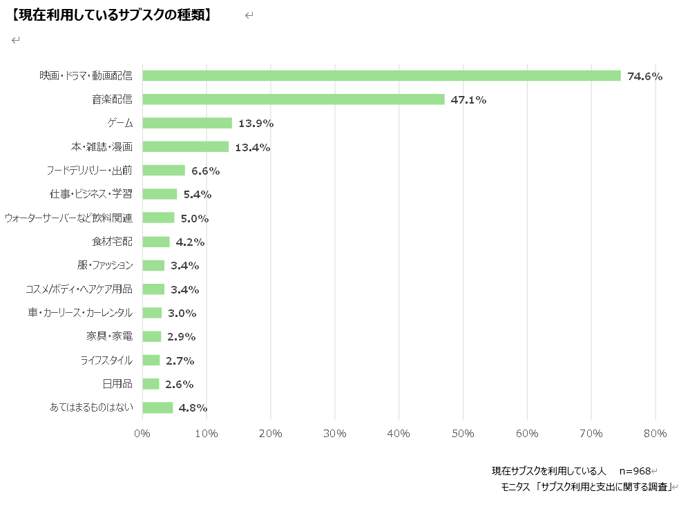 サブスク利用者において、利用率が最も高いサブスクサービスのジャンルは、「映画・ドラマ・動画配信」で74.6%。続いて高いのが「音楽配信」で47.1%となり、上記2コンテンツが大部分を占めるという結果になりました。