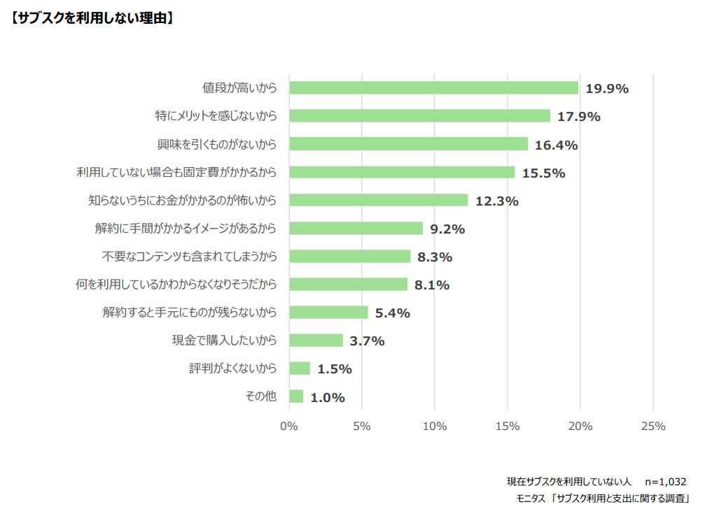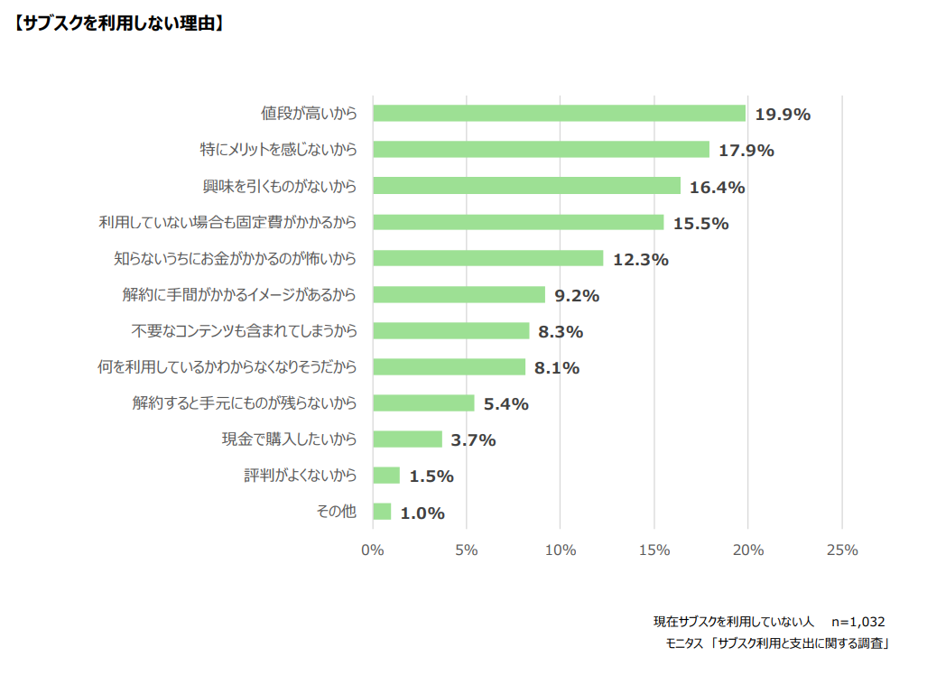 続いて、「特にメリットを感じない」「興味を引くものがない」という意見が上位となっています。サブスクというコンテンツ自体に魅力を感じていない人が多いことが分かりました。