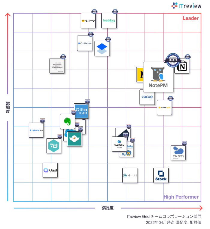 株式会社プロジェクト・モードが提供する、ナレッジ共有・社内wikiツール「NotePM ( https://notepm.jp )」は、アイティクラウド株式会社運営のIT製品レビューサイト「ITreview」において、満足度・認知度ともに優れた製品であると評価され、「ITreview Grid Award 2022 Spring」のチームコラボレーション部門とマニュアル編集・作成部門、グループウェア部門において「Leader」をW受賞いたしました。