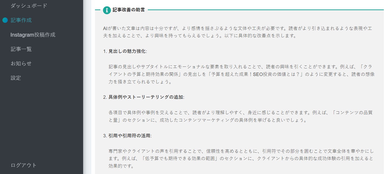 作成した記事に対して、AIが文章の改善点をアドバイスする機能を搭載しています。