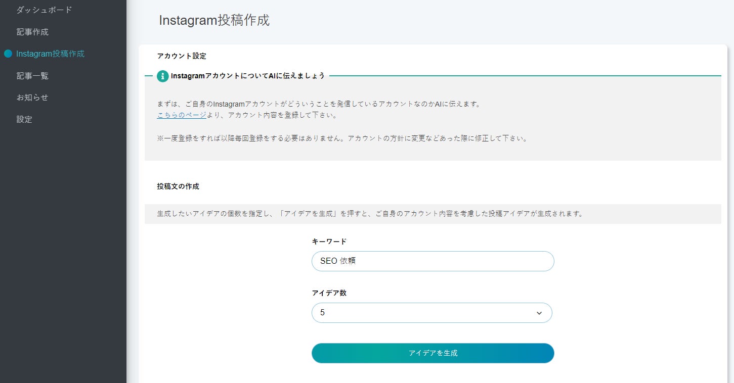 Instagramアカウントの情報を一度登録しておけば、AIがアイデア出しから投稿文の作成まで行ってくれます。Instagramで投稿するネタを日々考える必要がなくなり、運用の負担が大きく軽減されます。