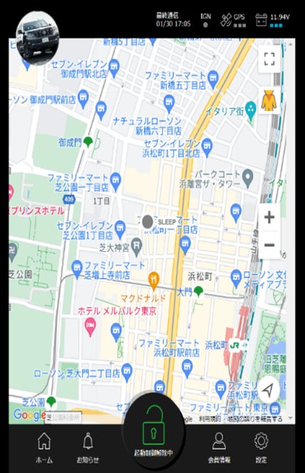 車両へセキュリティ部品を取り付けた後、専用Webサイトに登録することで、スマートフォンでエンジンの始動可否をコントロールできるようになります。セキュリティ警戒中にドア解錠された場合には、お客様のスマートフォンへ異常感知を通知します。また、万が一の盗難時には、セキュリティ本体のGPS機能により車両の現在地の追跡が可能です。