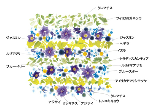 クレマチスやトルコキキョウ、アジサイなどの花々と、ジャスミンやトラディスカンティアなどの葉をストライプ状にアレンジ。汗ばむ陽気のなかに涼を感じられるデザインです。