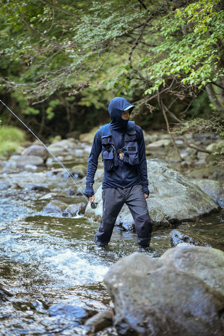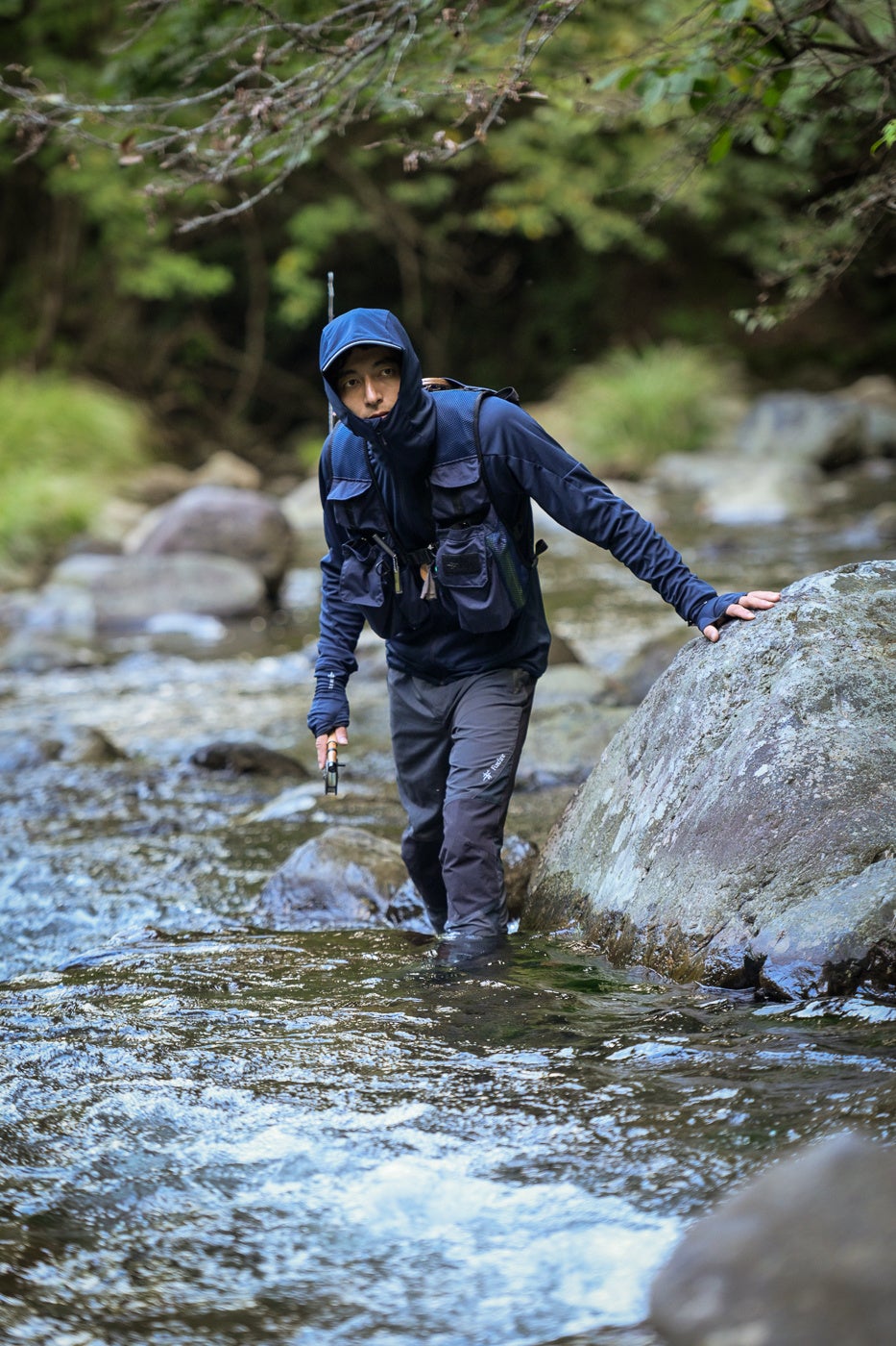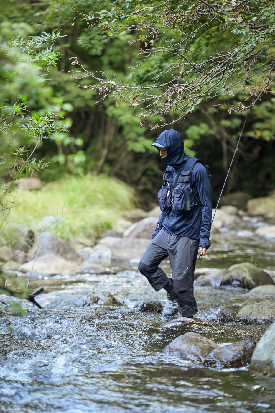 アウトドアでのアクティブな使用環境に対応するフルジップフーディ。防虫成分を表面のみにドット状にプリントする新技術「ドットオン加工」により、従来のパディング(ドブ漬け)加工よりも素材の柔らかさや通気性を確保しつつ、しっかりと防虫効果を発揮します。肩から肘にかけてのヨークは2重生地にして補強。動きによる耐性を高めました。防虫、吸汗速乾、UVカット機能を持つトランスウェット・スコーロン素材に接触冷感機能もプラスし、盛夏でもよりサラッとした着用感をキープ。フードは開口部が少ないバラクラバタイプで、顔の周りをしっかりとガードします。袖口はサムホール付きで、手の甲の虫や日焼け対策も万全なより機能的なアイテムです。