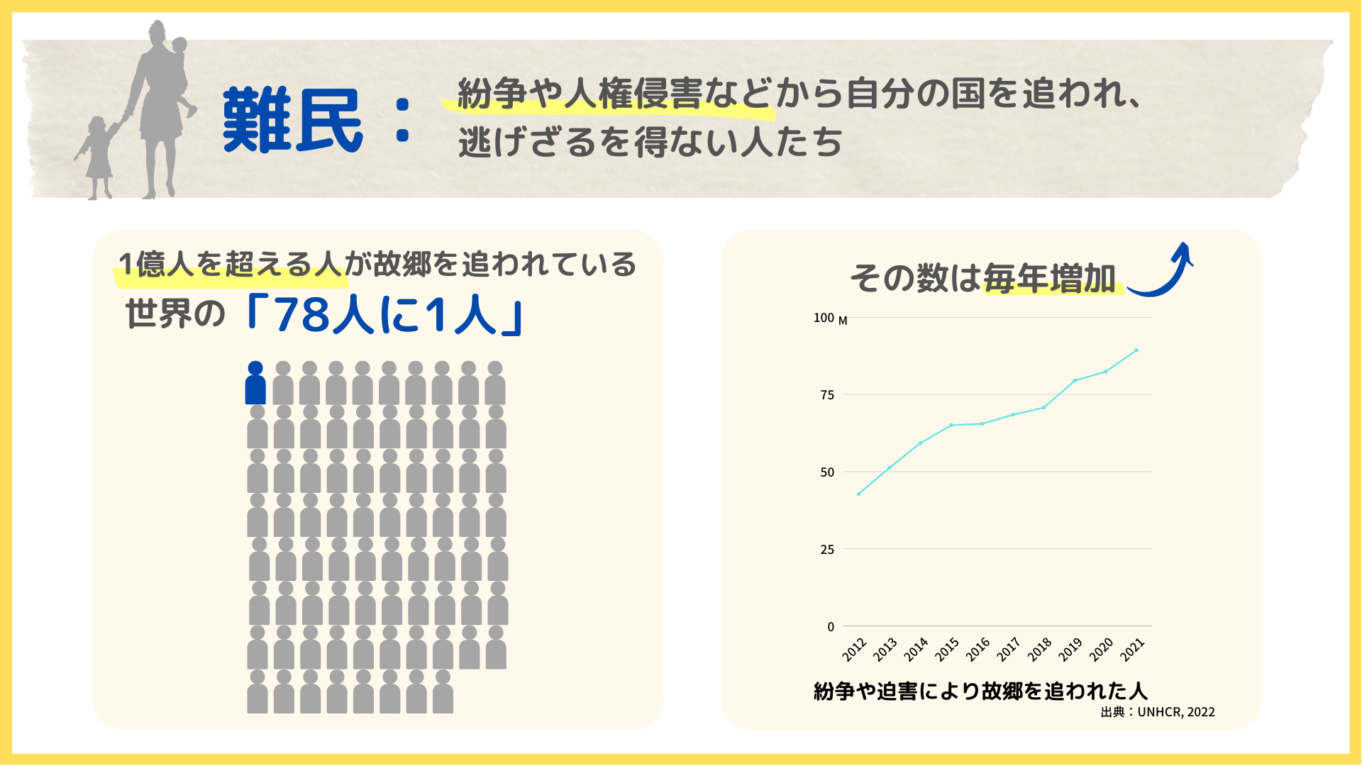 ロシアによるウクライナ侵攻などをきっかけに、難民の人々への関心が高まっています。