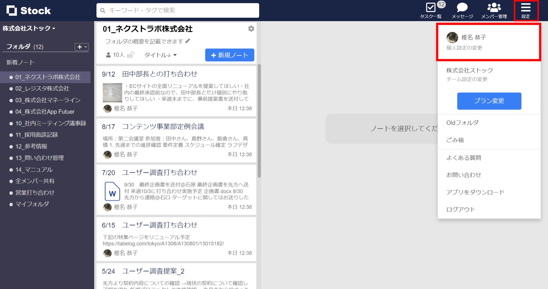 ①Stockにログイン後、ヘッダーより「設定」>「個人設定の変更」をクリックします。