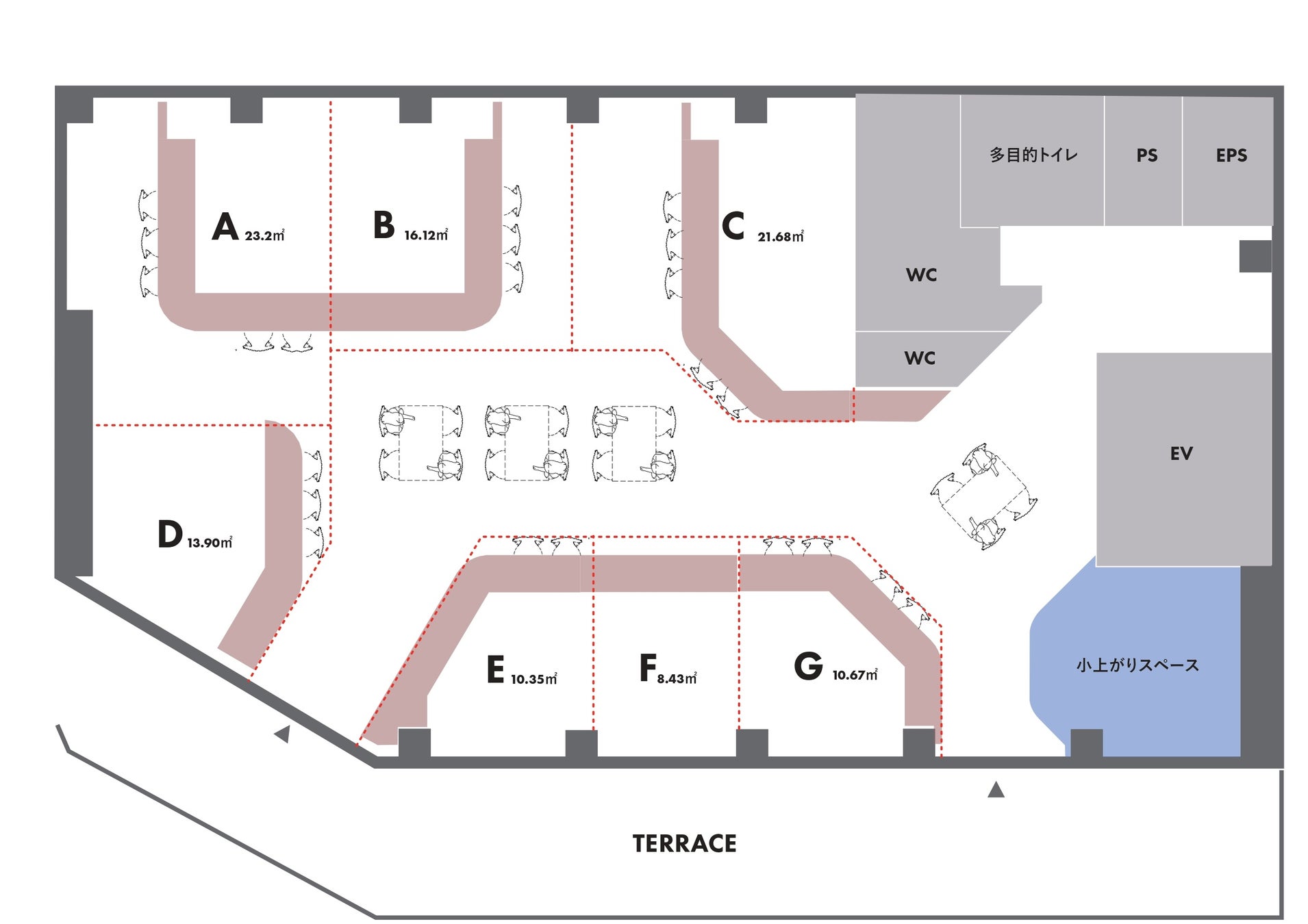 屋外階段から直接アクセスできる2階部分は、2坪~7坪ほどの小さな区画が7つ集まる飲食専用フロアとなります。