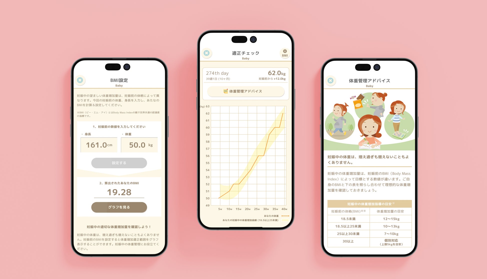 また、グラフとともに専門家監修による体重管理アドバイスを掲載。ママの体重管理を優しくサポートします。