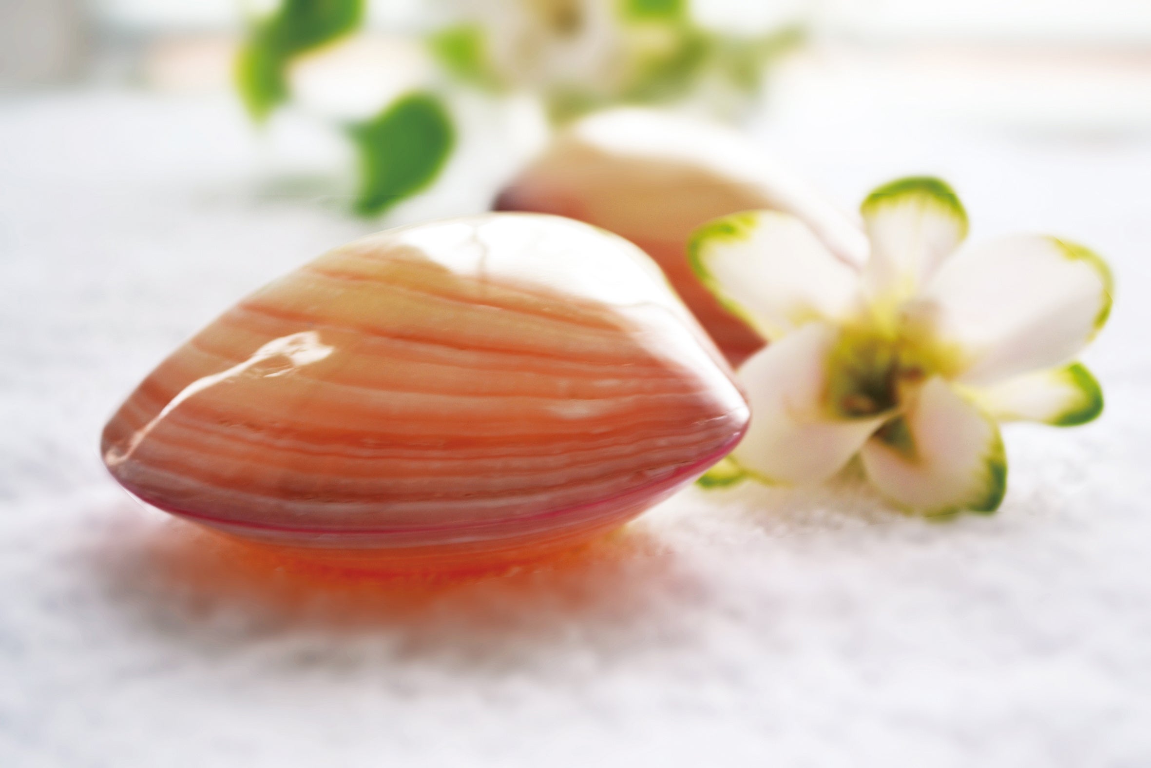 トリートメントには南太平洋で捕れるタイガーストライプシェルの「貝パウダー」を練り込んだ陶器製シェルを使用。温めたシェルの独特な形、感触を利用しリンパに沿って丁寧にケア。