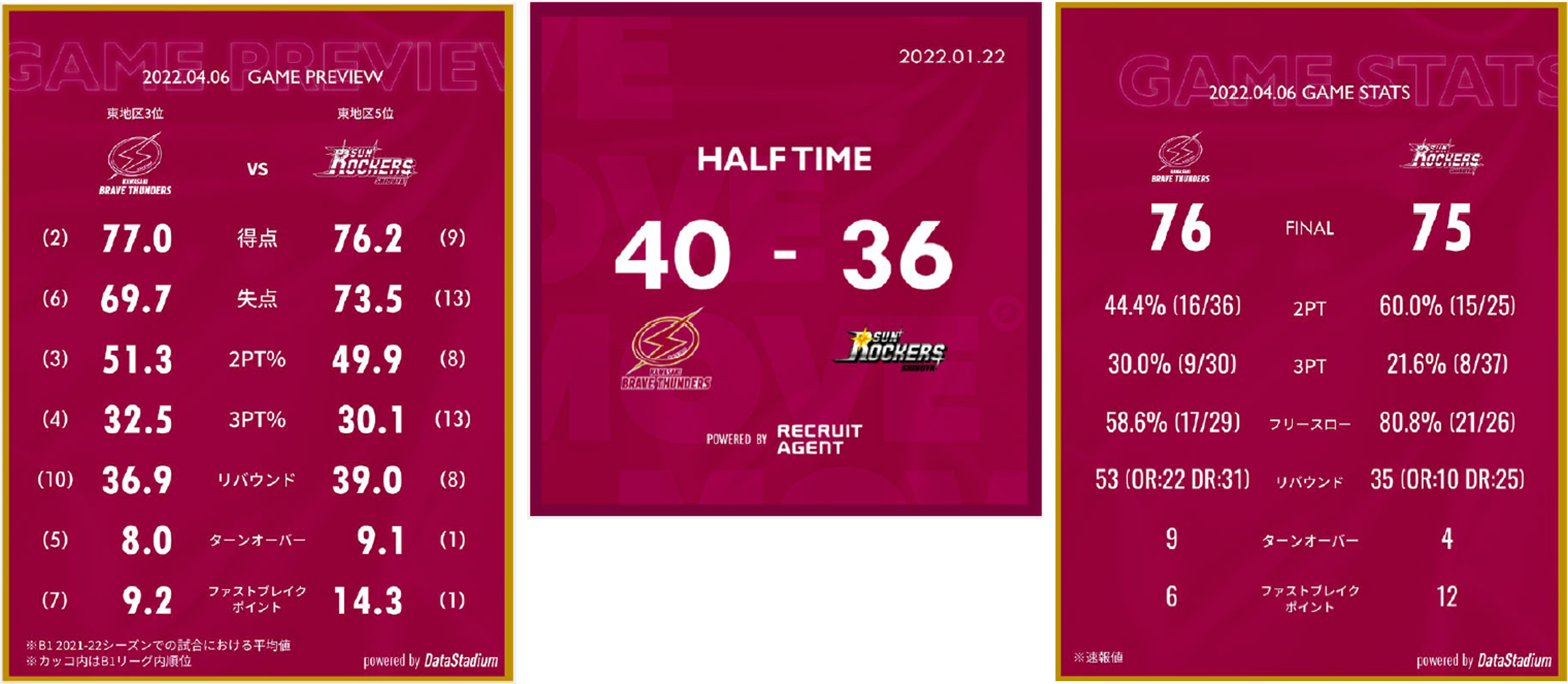 試合開始前から終了後までの一連の公式記録データをもとに、クラブカラーに応じたフォーマットをベースとし、選手写真やグラフなどとともに、最新のリアルタイムデータを反映させた画像をクラブに提供します。クラブは提供された画像をそのままSNSに投稿するだけで、視認性が高く、情報が整理されたSNS用コンテンツを簡単に展開することが可能です。 また、画像にはクラブのスポンサー広告も掲載できるため、スポンサーシップによる「収益化の機会」としての機能も担います。