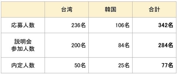 弊社にて台湾と韓国の説明会参加外国人人材284名のうち77名を内定とさせていただいている実績をもとに、